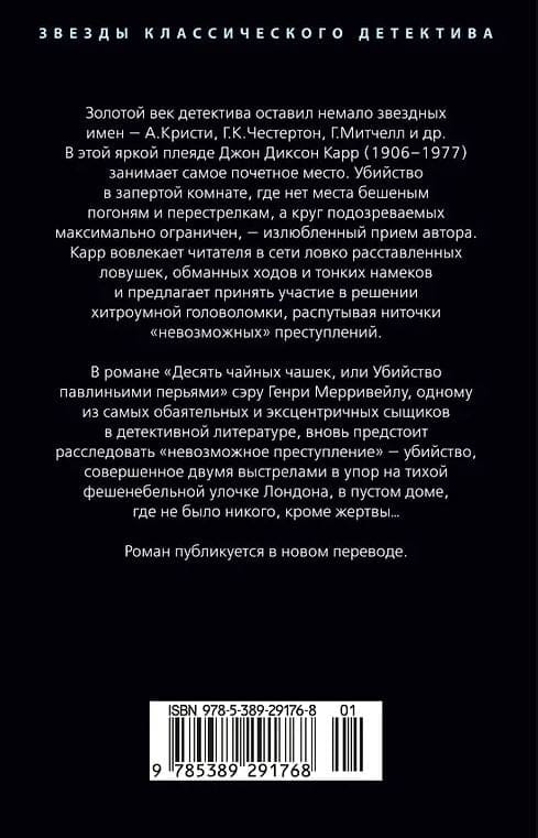 В романе «Десять чайных чашек, или Убийство павлиньими перьями» сэру Генри Мерривейлу, одному из самых обаятельных и эксцентричных сыщиков в детективной литературе, вновь предстоит расследовать «невозможное преступление» — убийство, совершенное двумя выстрелами в упор на тихой фешенебельной улочке Лондона, в пустом доме, где не было никого, кроме жертвы…