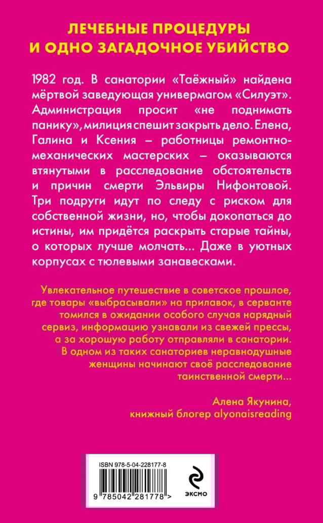 1982 год. В санатории «Таёжный» найдена мёртвой заведующая универмагом «Силуэт». Администрация просит «не поднимать панику», милиция спешит закрыть дело. Елена, Галина и Ксения — работницы ремонтно-механических мастерских — оказываются втянутыми в расследование обстоятельств и причин смерти Эльвиры Нифонтовой. Три подруги идут по следу с риском для собственной жизни, но чтобы докопаться до истины, им придётся раскрыть старые тайны, о которых лучше молчать… Даже в уютных корпусах с тюлевыми занавесками.