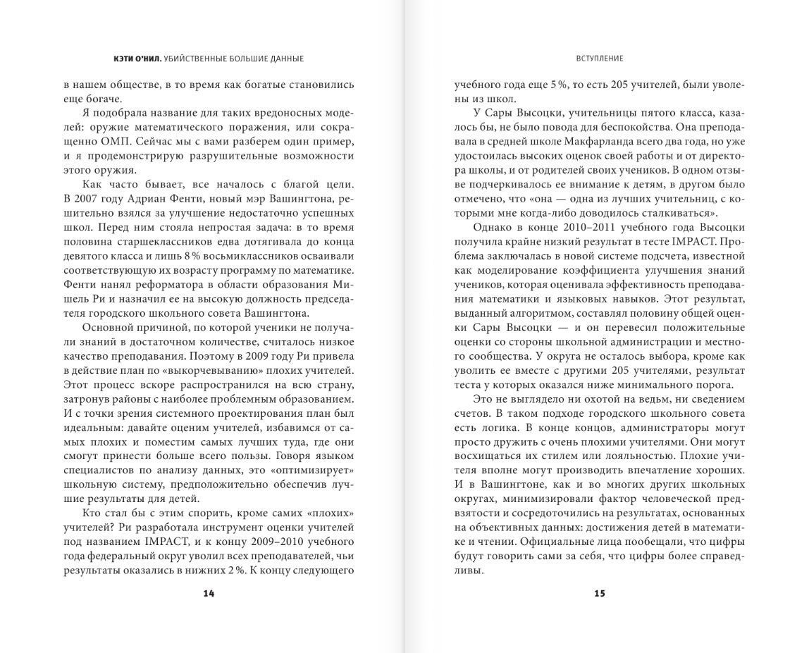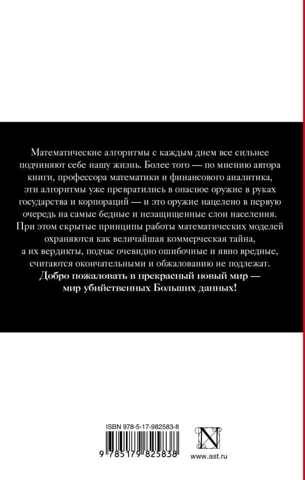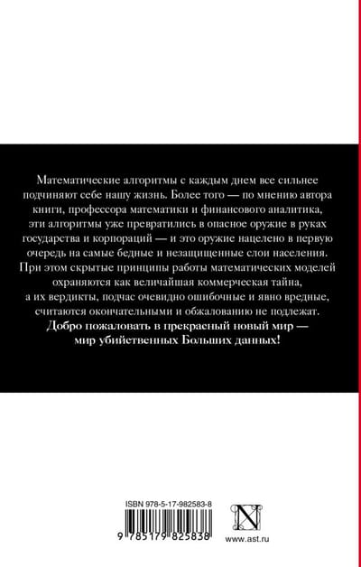 Математические алгоритмы с каждым днем все сильнее подчиняют себе нашу жизнь. Более того — по мнению автора книги, профессора математики и финансового аналитика, эти алгоритмы уже превратились в опасное оружие в руках государства и корпораций — и это оружие нацелено в первую очередь на самые бедные и незащищенные слои населения. При этом скрытые принципы работы математических моделей охраняются как величайшая коммерческая тайна, а их вердикты, подчас очевидно ошибочные и явно вредные, считаются окончательными и обжалованию не подлежат.