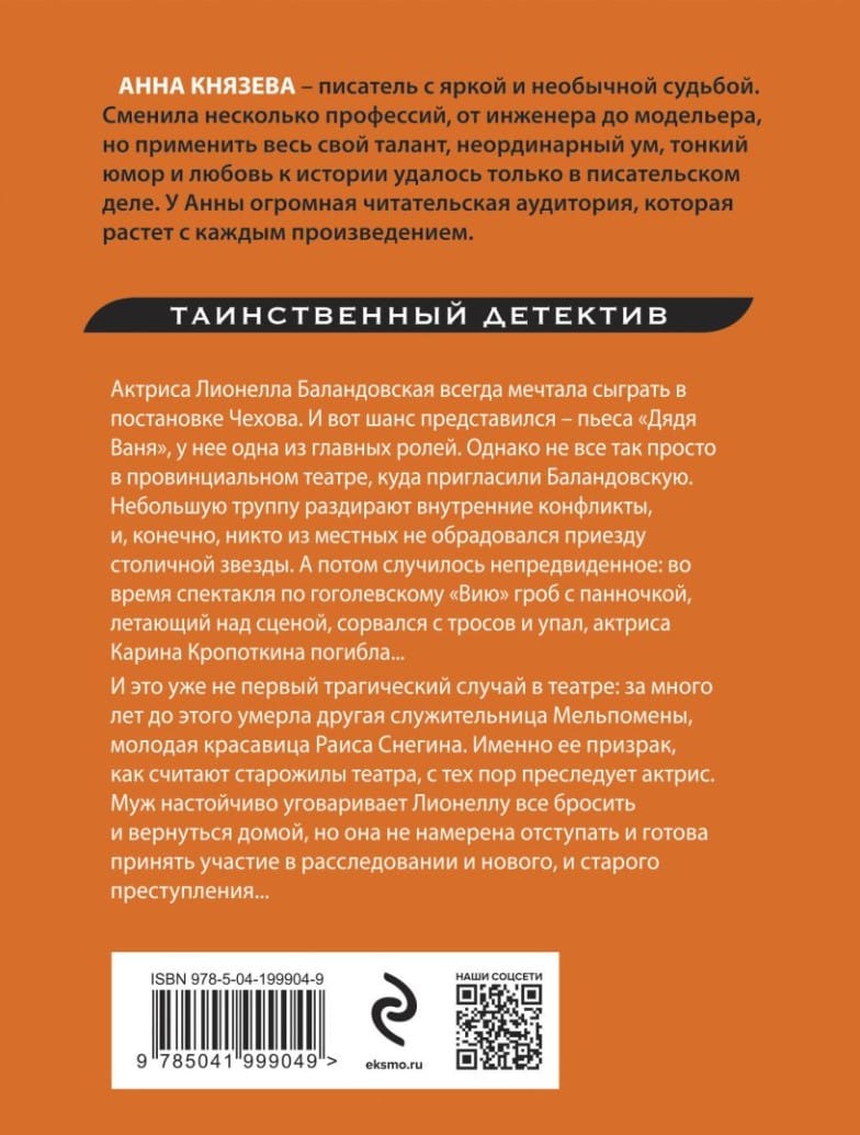 Актриса Лионелла Баландовская всегда мечтала сыграть на театральной сцене в постановке Чехова. И вот шанс представился – пьеса «Дядя Ваня», у Лионеллы одна из главных ролей. Однако не все так просто в провинциальном театре, куда пригласили Баландовскую. Небольшую труппу раздирают внутренние конфликты и противоречия, и, конечно, никто из местных не обрадовался приезду столичной звезды. А потом случилось непредвиденное: во время спектакля по гоголевскому «Вию» гроб с панночкой, летающий над сценой, сорвался с тросов и упал, актриса Карина Кропоткина погибла. И это уже не первый трагический случай в театре: за много лет до этого умерла другая служительница Мельпомены, молодая красавица Раиса Снегина. Именно ее призрак, как считают старожилы театра, с тех пор преследует актрис. Муж настойчиво уговаривает Лионеллу все бросить и вернутся домой, но она не намерена отступать и готова принять участие в расследовании и нового, и старого преступления...