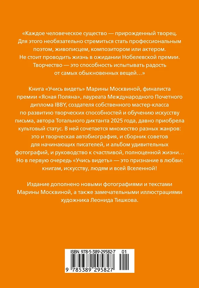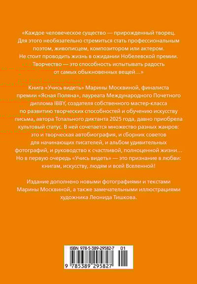 Книга «Учись видеть» Марины Москвиной давно приобрела культовый статус. В ней сочетается множество разных жанров: это и творческая автобиография, и сборник советов для начинающих писателей, и альбом удивительных фотографий, и руководство к счастливой, полноценной жизни… Но в первую очередь «Учись видеть» — это признание в любви: книгам, искусству, людям и всей Вселенной!