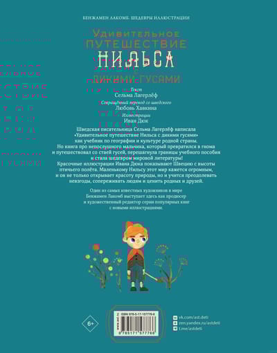 Красочные иллюстрации Ивана Дюка показывают Швецию с высоты птичьего полёта.  Маленькому Нильсу этот мир кажется огромным и он не только открывает красоту природы, он учится преодолевать невзгоды, сопереживать людям и ценить родных и друзей.
