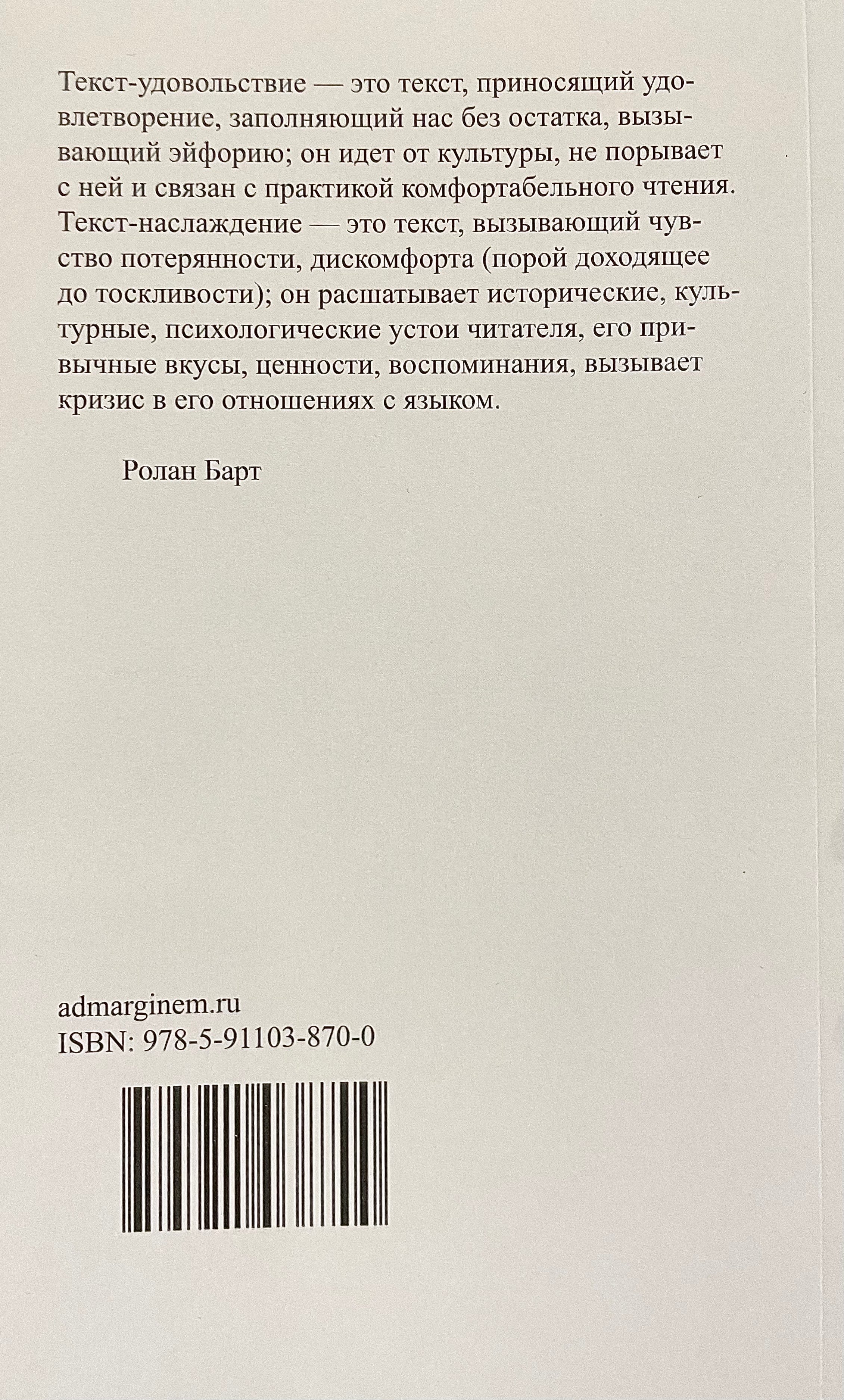 «Удовольствие от текста» (1973) — эссе французского философа, литературоведа и семиотика Ролана Барта, в котором он подробно рассматривает взаимоотношения между текстом, читателем и удовольствием от чтения. Развивая идеи лакановского психоанализа, автор противопоставляет два вида удовольствий от текста — через понятия plaisir («удовольствие») и jouissance («наслаждение») — и делит тексты на «читаемые» и «писательские». По мнению Барта, смысл текста не фиксирован, и при прочтении каждый читатель привносит свой собственный опыт и интерпретации, допуская множественность значений. Эта работа бросает вызов взглядам на авторство и уделяет особое внимание субъектности читателя, подчеркивая его роль в создании смысла текста.