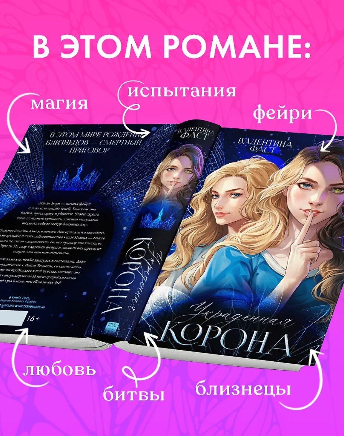 «Украденная корона» — захватывающее романтическое фэнтези с фейри, испытаниями и битвами от нового немецкого автора Trendbooks Валентины Фаст. Атмосферная история о жертве, выживании и силе, о мире, где враги становятся возлюбленными, а рождение близнецов — смертный приговор. Потрясающее издание с иллюстрированным обрезом и портретами главных героев на обложке — уникальный экземпляр книжной коллекции.