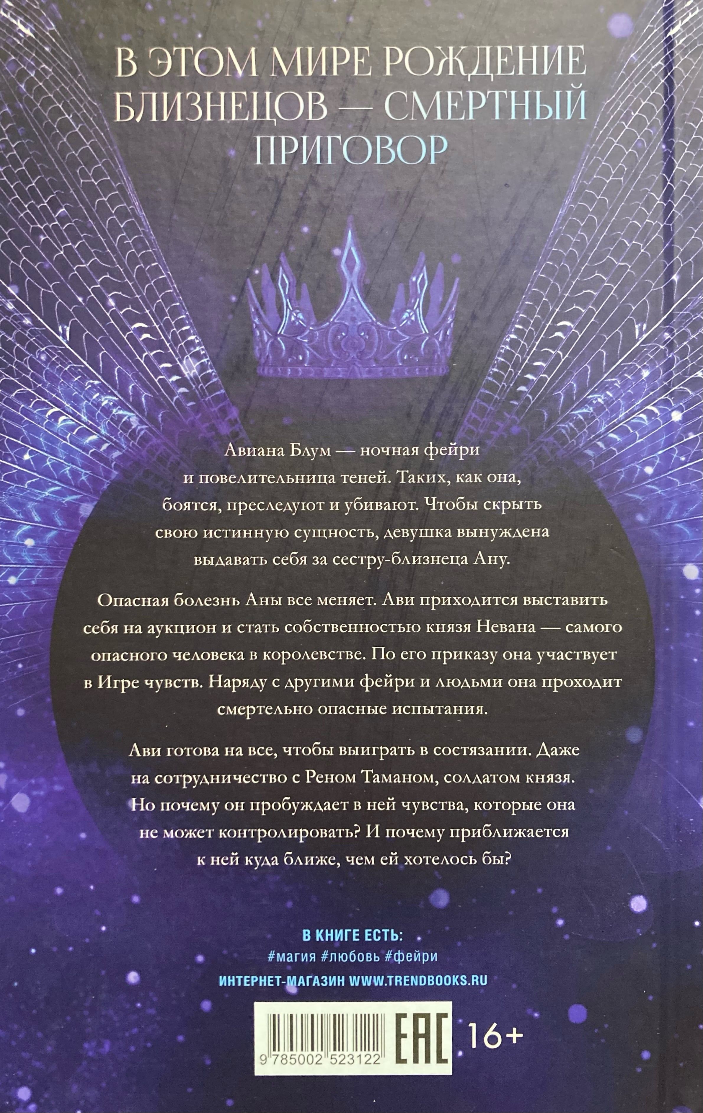 Авиана Блум — ночная фейри и повелительница теней. Таких, как она, боятся, преследуют и убивают. Чтобы скрыть свою истинную сущность, девушка вынуждена выдавать себя за сестру-близнеца Ану — без права на собственную жизнь и чувства.