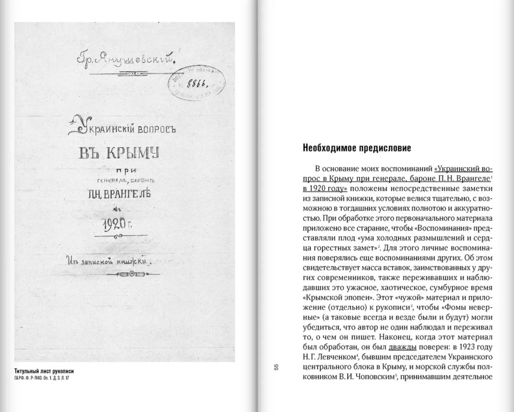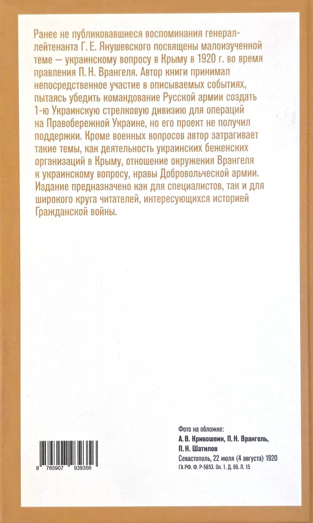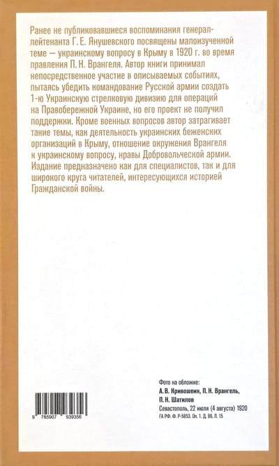 Ранее не публиковавшиеся воспоминания генерал-лейтенанта Г.Е. Янушевского посвящены малоизученной теме — украинскому вопросу в Крыму в 1920 г. во время правления П.Н. Врангеля. Автор книги принимал непосредственное участие в описываемых событиях, пытаясь убедить командование Русской армии создать 1‑ю Украинскую стрелковую дивизию для операций на Правобережной Украине, но его проект не получил поддержки. Кроме военных вопросов автор затрагивает такие темы, как деятельность украинских беженских организаций в Крыму, отношение окружения Врангеля к украинскому вопросу, нравы Добровольческой армии.