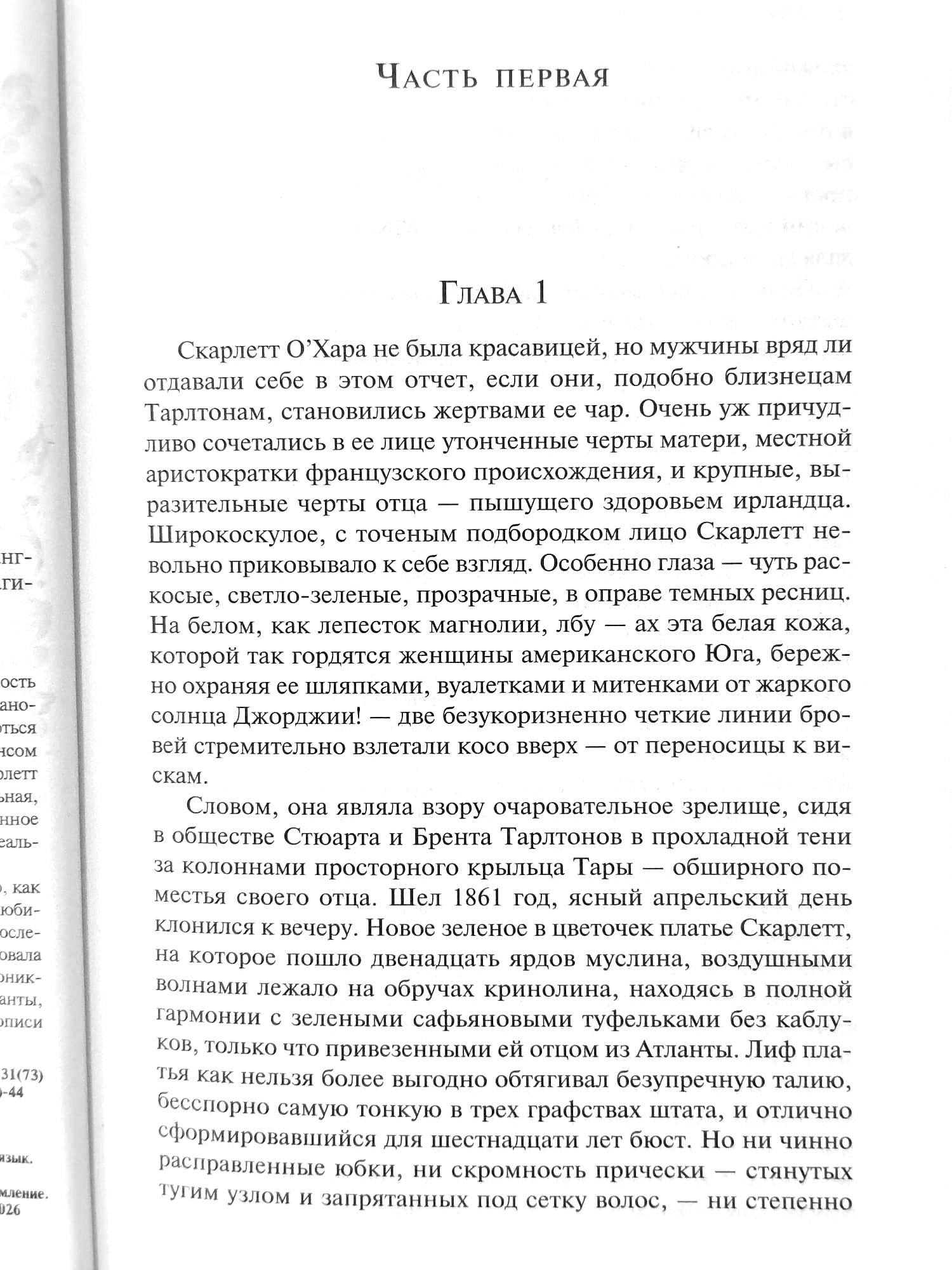 Скарлетт О'Хара — живой человек, с достоинствами и недостатками. Эта дерзкая, сильная, мужественная и упрямая женщина на каждой странице испытывает неустанное желание жить, радоваться, любить. Маргарет Митчелл создала ее настолько реальной, что в героине каждая читательница может увидеть себя.