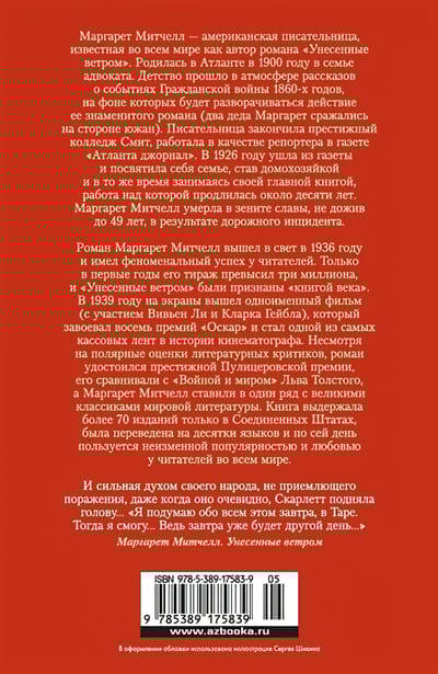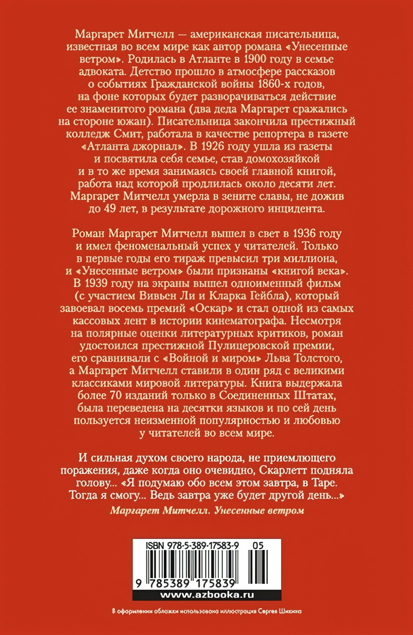 Роман Маргарет Митчелл вышел в свет в 1936 году и имел феноменальный успех у читателей. Только в первые годы его тираж превысил три миллиона, и «Унесенные ветром» были признаны «книгой века». В 1939 году на экраны вышел одноименный фильм (с участием Вивьен Ли и Кларком Гейблом), который завоевал восемь премий «Оскар» и стал одной из самых кассовых лент в истории кинематографа.