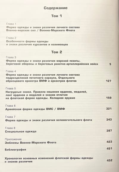 В данном томе рассматривается обмундирование и снаряжение морской пехоты и Береговых войск, форма одежды подразделений почетного караула, нагрудные знаки и правила их ношения, холодное оружие, армейская форма одежды ВМФ, форменная одежда Вспомогательного флота и специальная одежда, а также дается обзор эмблем ВМФ.