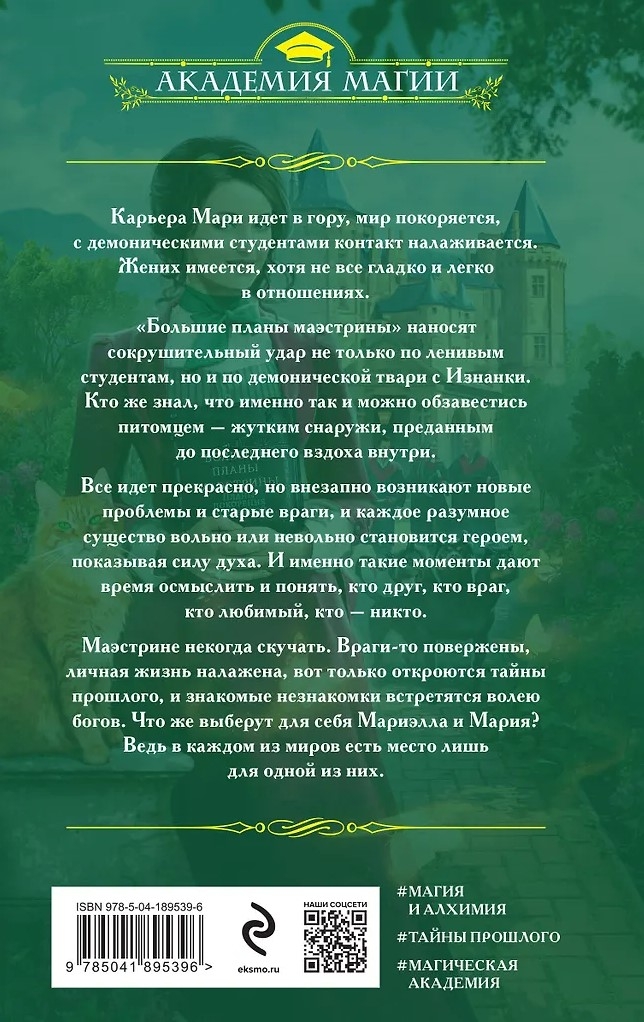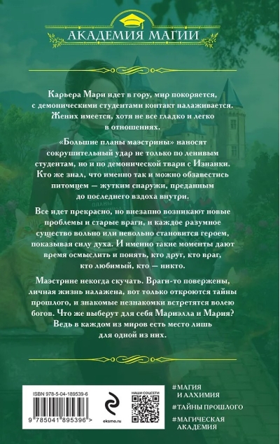 Карьера Мари идет в гору, мир покоряется, с демоническими студентами контакт налаживается. Жених имеется, хотя не все гладко и легко в отношениях. «Большие планы маэстрины» наносят сокрушительный удар не только по ленивым студентам, но и по демонической твари с Изнанки. Кто же знал, что именно так и можно обзавестись питомцем — жутким снаружи, преданным до последнего вздоха внутри. Все идет прекрасно, но внезапно возникают новые проблемы и старые враги, и каждое разумное существо вольно или невольно становится героем, показывая силу духа. И именно такие моменты дают время осмыслить и понять, кто друг, кто враг, кто любимый, кто — никто. Маэстрине некогда скучать. Враги-то повержены, личная жизнь налажена, вот только откроются тайны прошлого, и знакомые незнакомки встретятся волею богов. Что же выберут для себя Мариэлла и Мария? Ведь в каждом из миров есть место лишь для одной из них.