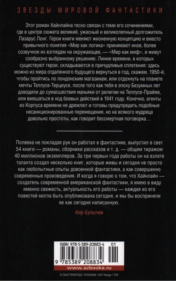 Этот роман Хайнлайна тесно связан с теми его сочинениями, где во главе сюжета великий, ужасный и великолепный долгожитель Лазарус Лонг. Герои книги меняют жизненную концепцию и вместо привычного понятия «Мир как логика» принимают иное, более созвучное их взглядам на окружающее, — «Мир как миф», и живут сообразно выбранному решению. Линии времени, в которых существуют герои, складываются в причудливые сплетенья, здесь можно из мира отдаленного будущего вернуться в год, скажем, 1950-й, чтобы пройтись по лондонским магазинам, или отдохнуть на планете мечты Теллусе-Терциусе после того, как тебя в эпоху Безумных лет доводили до сумасшедствия маньяки от религии на Теллусе-Прайме, или вмешаться в ход боевых действий в 1941 году. Конечно, агенты из Корпуса времени не дремлют и готовы предупредить подобные несанкционированные перемещения, но на всякого мудреца довольно простоты, как говорит бессмертная поговорка… В настоящем издании перевод доработан и дан в новой редакции.