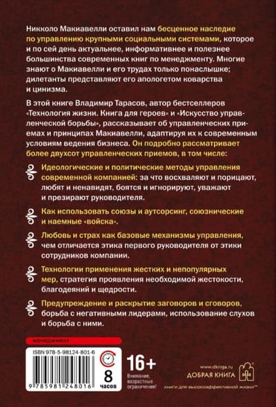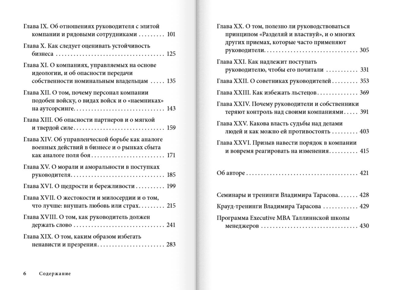 В этой книге Владимир Тарасов, автор бестселлеров «Технология жизни. Книга для героев» и «Искусство управленческой борьбы», рассказывает об управленческих приемах и принципах Макиавелли, адаптируя их к современным условиям ведения бизнеса. Он подробно рассматривает более 200 управленческих приемов, в том числе: