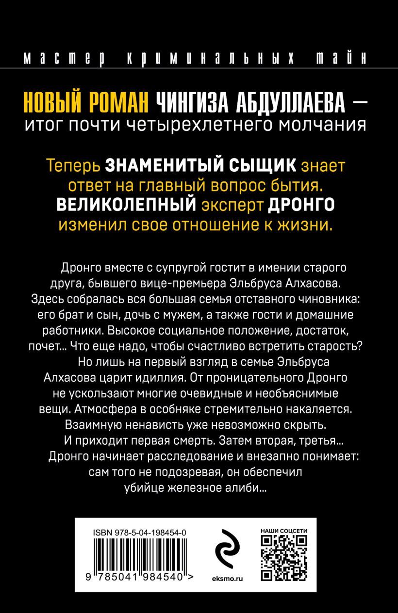 Итог почти четырехлетнего молчания. Теперь знаменитый сыщик знает ответ на главный вопрос бытия. Великолепный эксперт Дронго изменил свое отношение к жизни. Это незаменимый роман для отцов и детей. Вечная тема в блестящем исполнении мастера детективного жанра. Роман пронизан духом тихой скорби, которую испытывает автор по поводу морального облика, нравов и цинизма нынешнего поколения. Этот роман заметно отличается от всех его прежних произведений.