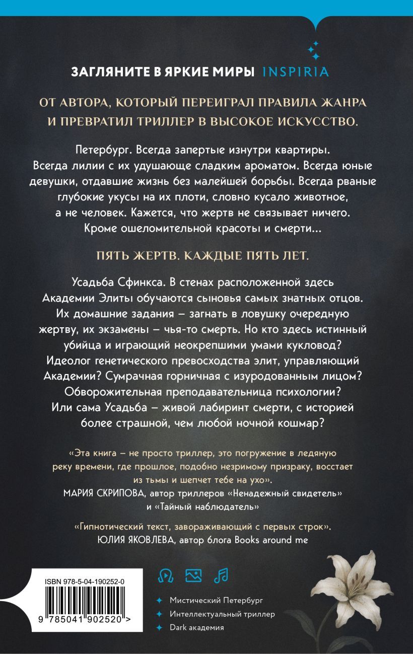 Усадьба Сфинкса. В расположенной ее стенах Академии Элиты обучаются сыновья самых знатных отцов. Их домашние задания — загнать в ловушку очередную жертву, их экзамены — чья-то смерть. Но кто здесь истинный убийца и играющий неокрепшими умами кукловод? Идеолог генетического превосходства элит, управляющий Академии? Сумрачная горничная с изуродованным лицом? Обворожительная преподавательница психологии? Или сама Усадьба — живой лабиринт смерти, с историей, более страшной, чем любой ночной кошмар?