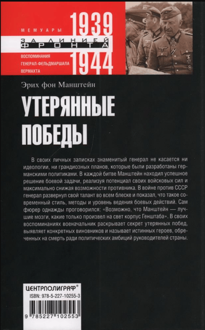 В своих личных записках знаменитый генерал не касается ни идеологии, ни грандиозных планов, которые были разработаны германскими политиками. В каждой битве Манштейн находил успешное решение боевой задачи, реализуя потенциал своих войсковых сил и максимально снижая возможности противника. В войне против СССР генерал развернул свой талант во всем блеске и показал, что такое современный стиль, методы и уровень ведения боевых действий. Сам фюрер однажды проговорился: "Возможно, что Манштейн - лучшие мозги, какие только произвел на свет корпус Генштаба". В своих воспоминаниях военачальник раскрывает секрет проигранных побед, выявляет конкретных виновников и называет истинных героев, обреченных на смерть ради политических амбиций руководителей страны.