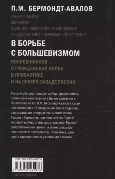Русский офицер, генерал-майор, представитель прогерманского течения в Белом движении в Прибалтике князь П.М. Бермондт-Авалов в своих воспоминаниях о Гражданской войне подробно рассматривает историю взаимоотношений России и Германии, причины начала Первой мировой войны, этапы формирования Русской добровольческой армии, а также описывает политическое положение в Прибалтике, дает яркие характеристики участникам событий.