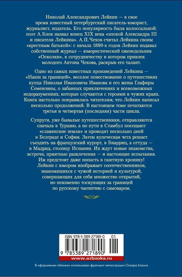Николай Александрович Лейкин — в свое время известный петербургский писатель-юморист, журналист, издатель. Одно из самых известных произведений Лейкина — «Наши за границей», веселое повествование о путешествиях купца Николая Ивановича Иванова и его жены Глафиры Семеновны, о забавных приключениях и всевозможных недоразумениях, которые случаются с героями в чужих краях. Книга настолько понравилась читателям, что Лейкин написал несколько продолжений. В настоящем томе печатаются третья и четвертая (последняя) части цикла.