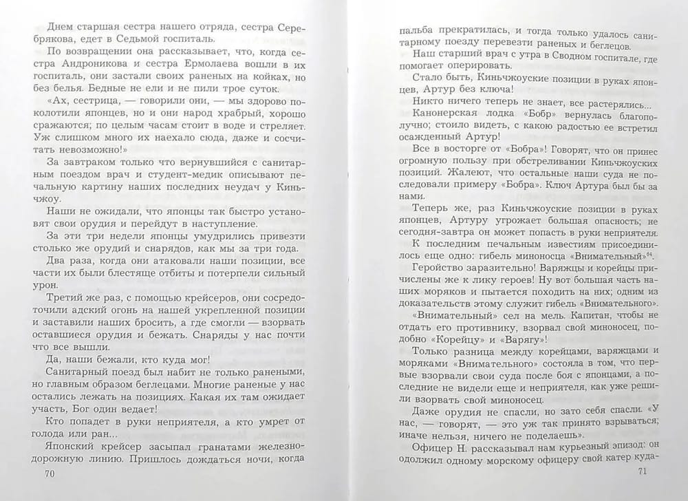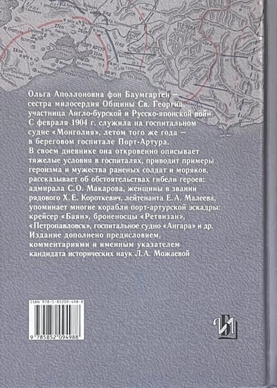 Ольга Аполлоновна фон Баумгартен — сестра милосердия Общины Св. Георгия, участница Англо-бурской и Русско-японской войн. С февраля 1904 г. служила на госпитальном судне «Монголия», летом того же года — в береговом госпитале Порт-Артура. В своем дневнике она откровенно описывает тяжелые условия в госпиталях, приводит примеры героизма и мужества раненых солдат и моряков, рассказывает об обстоятельствах гибели героев: адмирала С. О. Макарова, женщины в звании рядового X. Е. Короткевич, лейтенанта Е. А. Малеева, упоминает многие корабли порт-артурской эскадры: крейсер «Баян», броненосцы «Ретвизан», «Петропавловск», госпитальное судно «Ангара» и др. Издание дополнено предисловием, комментариями и именным указателем кандидата исторических наук Л. А. Можаевой.
