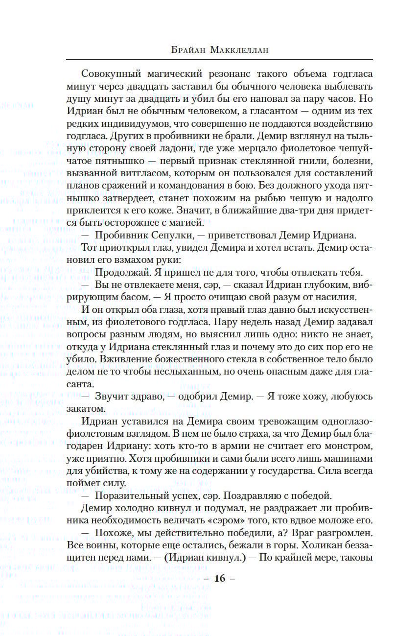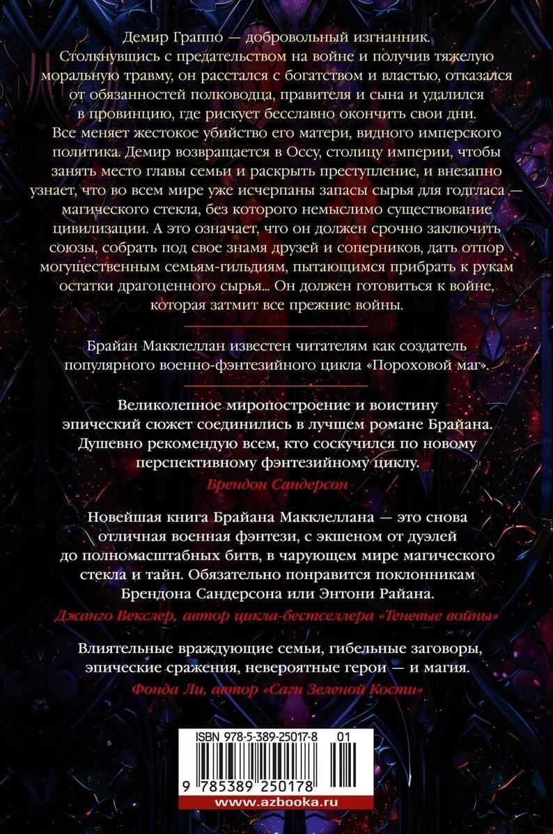 Демир возвращается в Оссу, столицу империи, чтобы занять место главы семьи и раскрыть преступление, и внезапно узнает, что во всем мире уже исчерпаны запасы сырья для годгласа — магического стекла, без которого немыслимо существование цивилизации. А это означает, что он должен срочно заключить союзы, собрать под свое знамя друзей и соперников, дать отпор могущественным семьям-гильдиям, пытающимся прибрать к рукам остатки драгоценного сырья... Он должен готовиться к войне, которая затмит все прежние войны. Брайан Макклеллан известен читателям как создатель популярного военно-фэнтезийного цикла «Пороховой маг».