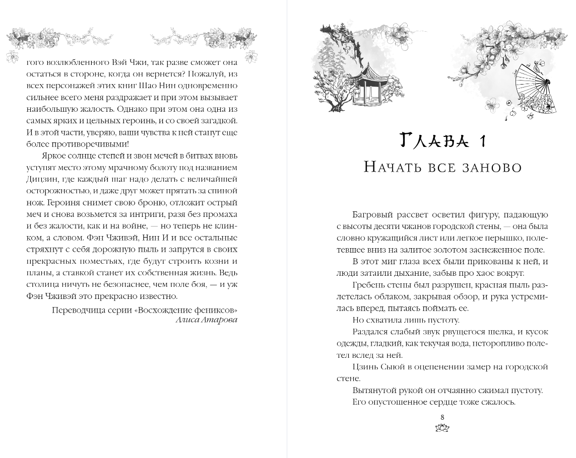 Долгожданное продолжение романа Тянься Гуйюань «Восхождение фениксов». В четвертом томе Нин И возвращает Фэн Чживэй в столицу Дицзин. Однако прежде не без помощи секретной техники лекаря Цзуна он запечатывает воспоминания девушки, но не чувства. Теперь героям вновь предстоит окунуться в омут интриг императорского дворца. На страницах романа читателя ждет Древний Китай с завораживающими весенними пейзажами. Вместе с героями вы вновь прогуляетесь по судьбоносному мосту из первого тома серии, прокатитесь на лодке по реке Лошуй, сразитесь со Вторым принцем Нин Шэном и, конечно, погрузитесь в любовные перипетия Нин И и Фэн Чживэй.