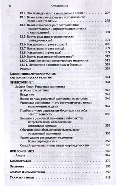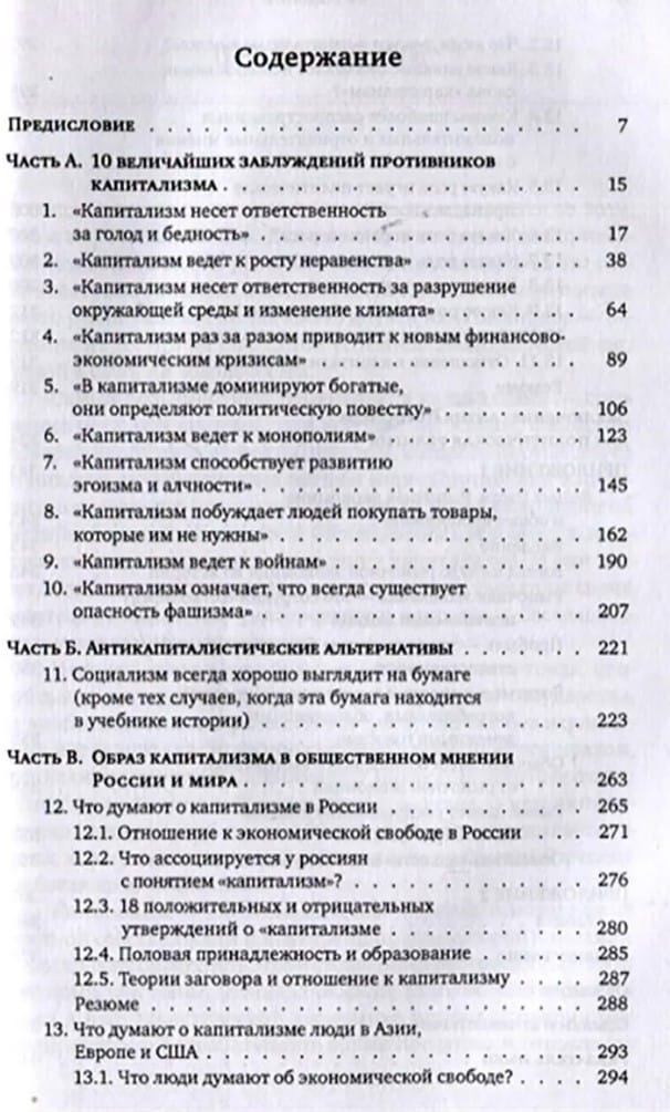 В первой части книги Райнер Цительманн, немецкий историк и социолог, а также успешный предприниматель, опираясь на статистику и исторические факты, показывает несостоятельность десяти наиболее распространенных возражений против капитализма: якобы он ведет к голоду и бедности, к росту неравенства, к ненужному потреблению и разрушению окружающей среды и изменению климата, к финансовым кризисам и войнам; якобы при капитализме во главу угла ставится только прибыль в ущерб человечности, господствуют монополии, а демократия разрушается. Во второй части рассказывается о наиболее трагических эпизодах попыток строительства социализма в таких странах, как СССР, Китай и Камбоджа. В третьей части публикуются результаты уникального социологического опроса, проведенного по заказу автора в 21 стране. Цель опроса — выяснить, как жители Европы, Азии, Южной и Северной Америки и Австралии (структурированные по полу, возрасту, политическим взглядам) относятся к капитализму и экономической свободе. Отдельная глава посвящена итогам этого опроса в России.