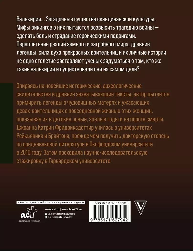 Валькирии... Загадочные существа скандинавской культуры. Мифы викингов о них пытаются возвысить трагедию войны — сделать боль и страдание героическими подвигами. Переплетение реалий земного и загробного мира, древние легенды, сила духа прекрасных воительниц и их личные истории не одно столетие заставляют ученых задуматься о том, кто же такие валькирии и существовали они на самом деле? Опираясь на новейшие исторические, археологические свидетельства и древние захватывающие тексты, автор пытается примирить легенды о чудовищных матерях и ужасающих девах‑воительницах с повседневной жизнью этих женщин, показывая их в детские, юные, зрелые годы и на пороге смерти. Джоанна Катрин Фридриксдоттир училась в университетах Рейкьявика и Брайтона, прежде чем получить докторскую степень по средневековой литературе в Оксфордском университете в 2010 году. Затем проходила научно‑исследовательскую стажировку в Гарвардском университете.