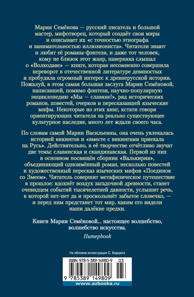 Мария Семёнова — русская писательница и большой мастер, мифотворец, который создаёт свои миры и описывает их «с точностью этнографа и занимательностью иллюзиониста». Читатели знают и любят её романы-фэнтези, и даже тот человек, кому не близок этот жанр, наверняка слышал о «Волкодаве» — книге, которая несомненно совершила переворот в отечественной литературе девяностых и пробудила огромный интерес к древнерусской истории. Пожалуй, в этом самая большая заслуга Марии Семёновой, написавшей, помимо фэнтези, научно-популярную энциклопедию «Мы — славяне!», ряд исторических романов, повестей, очерков и пересказавшей языческие мифы. Некоторые из этих книг — кстати говоря, ориентирующих читателя на реально существующее культурное наследие, — много лет ждали своего часа. По словам самой Марии Васильевны, она очень увлекалась историей викингов и «вместе с викингами приехала на Русь». Действительно, в её творчестве отчётливо звучат две темы: славянская и скандинавская. Первой из них, в основном, посвящён сборник «Валькирия», объединяющий одноимённый роман, несколько повестей и художественный пересказ языческих мифов «Поединок со Змеем». Читатель совершит метафизическое путешествие в прошлое: вдохнёт воздух загадочной древности, станет очевидцем событий тысячелетней давности, услышит речь, в которой нет-нет да и проскользнёт забытое словечко, — и перед ним предстанет тот мир, каким его видели наши далёкие предки.