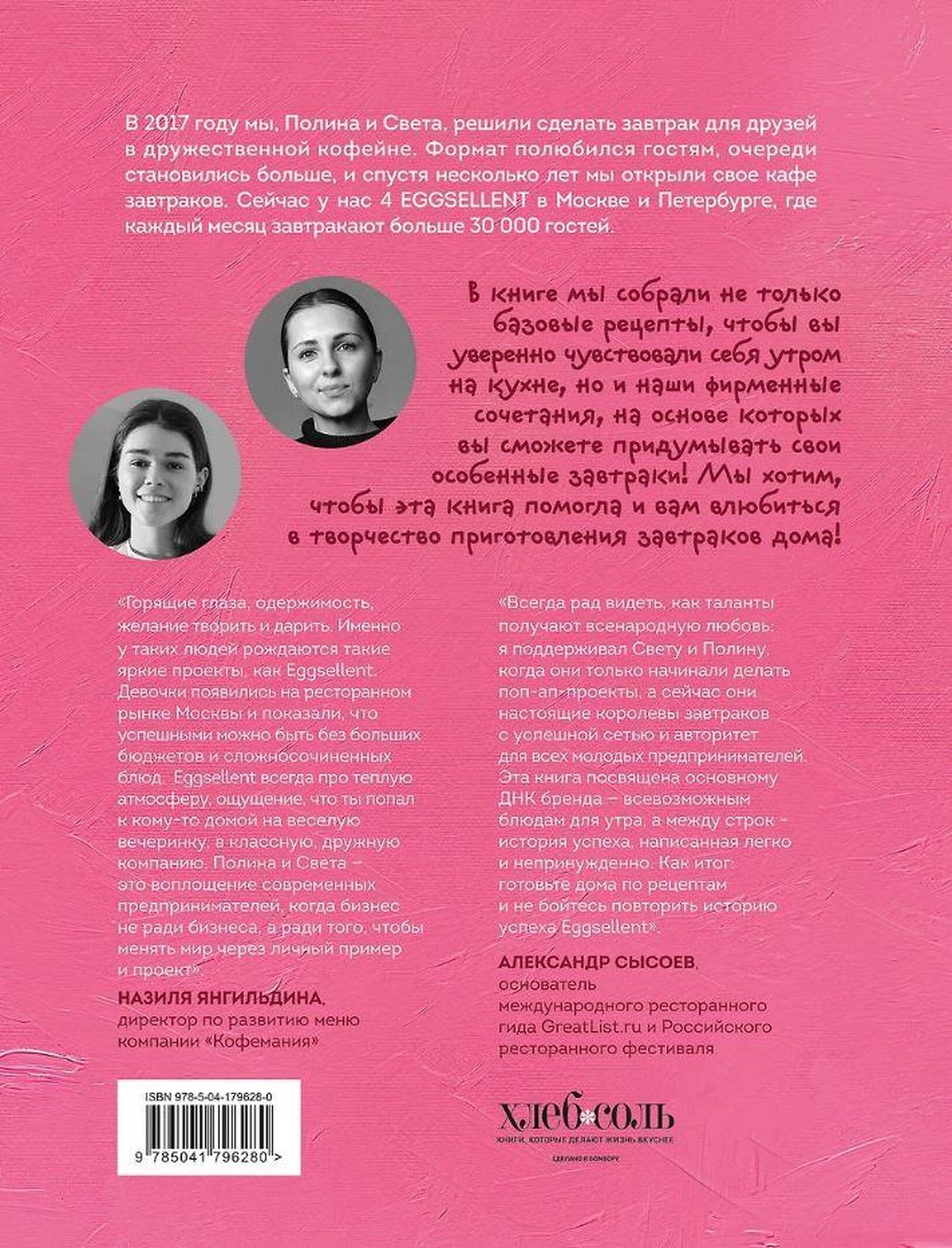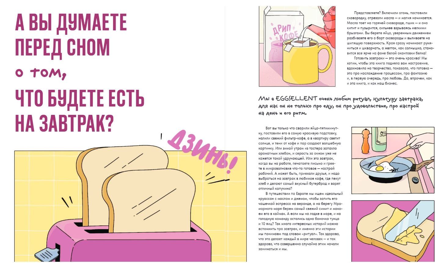 А вы готовите завтраки дома? Даже если нет, книга основательниц кафе Eggsellent Светланы Михалёвой и Полины Юровой точно вас вдохновит. Ведь просто невозможно устоять, глядя на мягчайшую утреннюю булочку со скремблом и беконом, овсянку качо-э-пепе или яркий матча-тост. Дополните их чашкой свежесваренного кофе — и вот она, красота и магия утра.