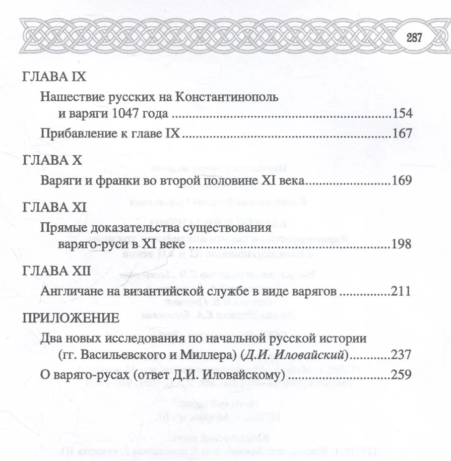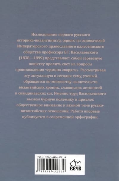 Исследование первого русского историка-византиниста, одного из основателей Императорского православного палестинского общества профессора В.Г. Васильевского (1838—1899) представляет собой серьезную попытку пролить свет на вопросы происхождения термина «варяги». Рассматривая эту актуальную и сегодня тему, ученый обращается ко множеству свидетельств византийских хроник, славянских летописей и скандинавских саг. Именно труд Васильевского вызвал бурную полемику и привлек общественное внимание к важной теме русско-византийских отношений. Работа впервые публикуется в современной орфографии.