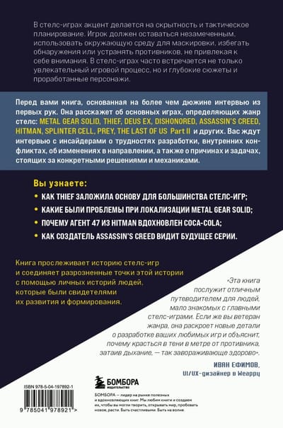 Перед вами книга, основанная на более чем дюжине интервью из первых рук. Она расскажет об основных играх, определяющих жанр стелс: Metal Gear Solid, Thief, Deus Ex, Dishonored, Assassin’s Creed, Hitman, Splinter Cell, Prey, The Last of Us Part II и других. Вас ждут интервью с инсайдерами о трудностях разработки, внутренних конфликтах, об изменениях в направлении, а также о причинах и задачах, стоящих за конкретными решениями и механиками.