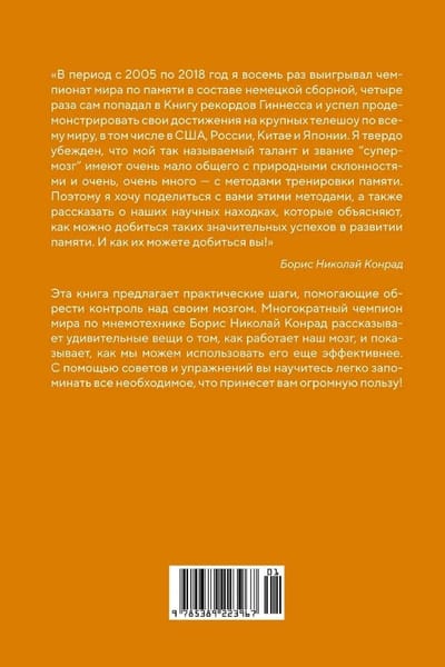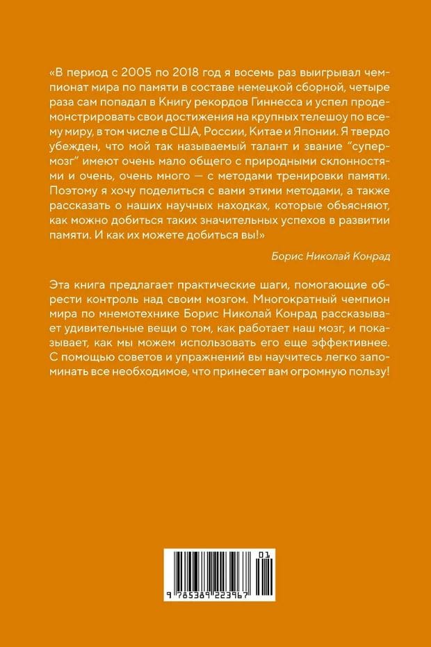 Книга известного эксперта в области работы памяти, чемпиона мира по мнемотехнике Бориса Николая Конрада резюмирует его опыт, накопленный почти за 20 лет тренировок по запоминанию, и содержит простые и эффективные рекомендации.