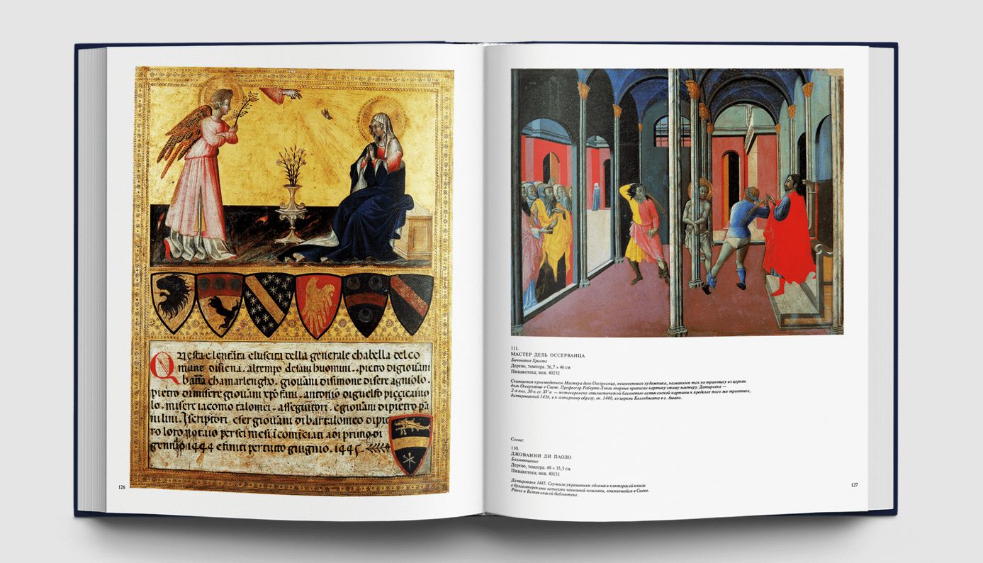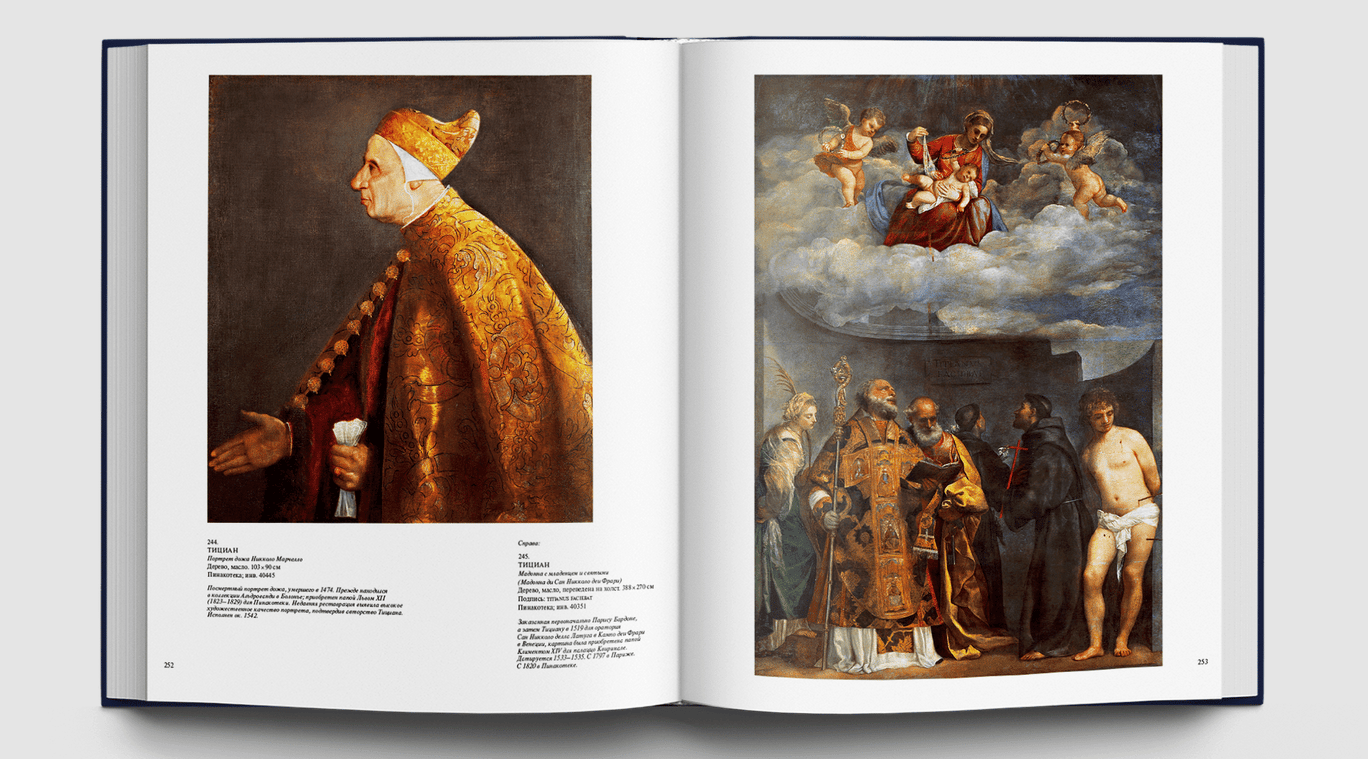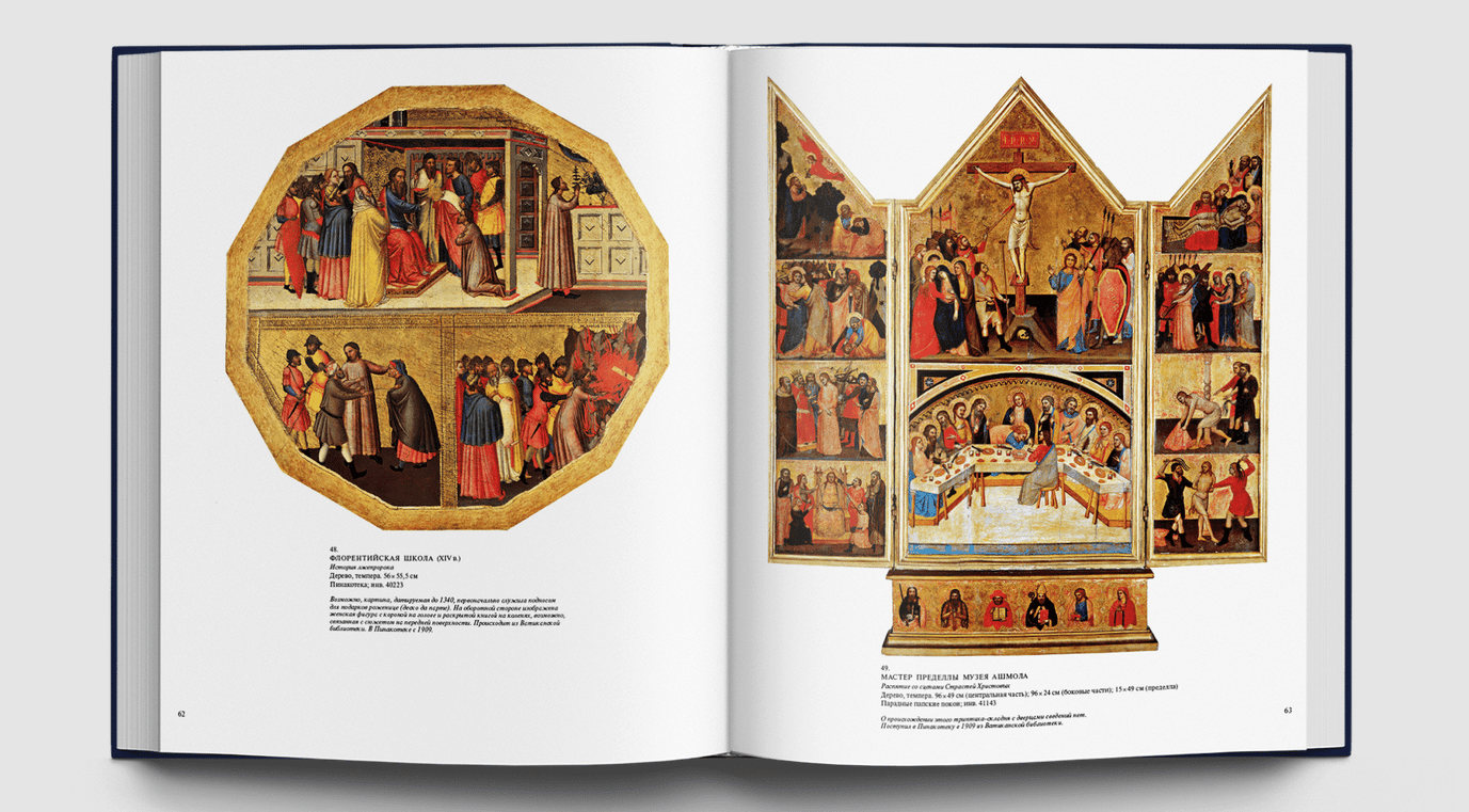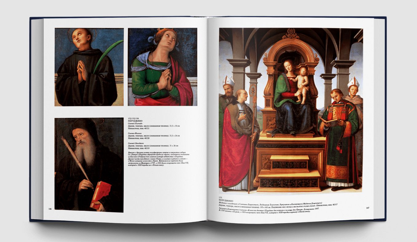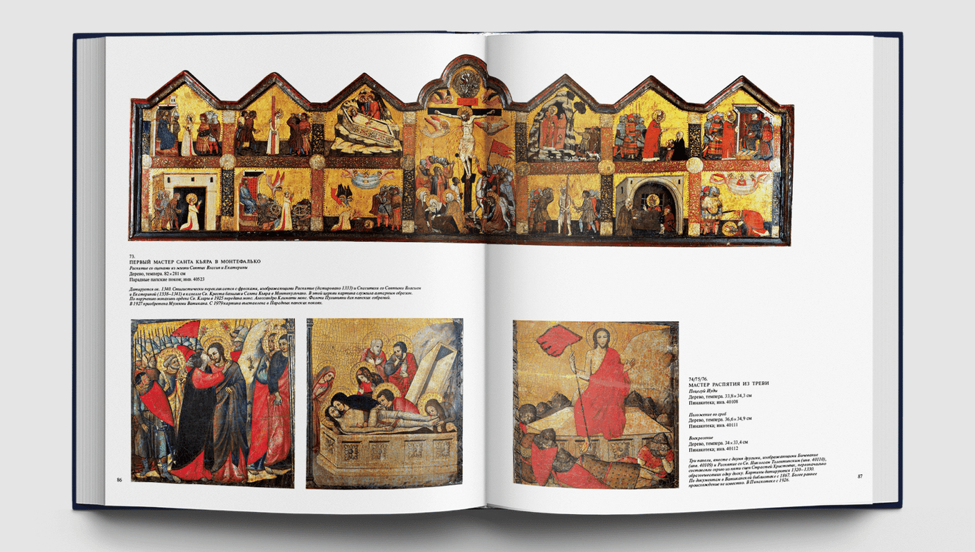 Станковые картины, алтарные образы, драгоценные пределлы привозили сюда из многих городов Италии просто как замечательные создания искусства, без какой бы то ни было организующей идеи. Папа Пий IV повелел собрать разрозненные произведения живописи из папских дворцов, заложив тем самым основу систематизированной музейной коллекции. Шедевры Ватикана всегда будут вызывать наше восхищение, ведь среди них — большой «Триптих» Джотто, очаровательные «Музицирующие ангелы» Мелоццо да Форли, редчайшая пределла с «Чудесами Святого Винченцо Феррера» кисти Эрколе де Роберти, «Мадонна ди Фолиньо», «Коронование Марии» и «Преображение» Рафаэля, «Святой Иероним» Леонардо да Винчи, скорбный «Плач над мертвым Христом» Джованни Беллини, «Алтарный образ» Тициана из церкви Сан Николо деи Фрари, «Снятие с креста» Караваджо, «Мученичество Святого Эразма» Пуссена и известнейшие работы Гверчино и Гвидо Рени. Картины и фрески, собранные в Ватикане, позволяют познакомиться с историей живописи от Средневековья до XVIII века и соприкоснуться с высочайшими вершинами искусства. Многие из этих произведений ранее никогда не воспроизводились в наших изданиях