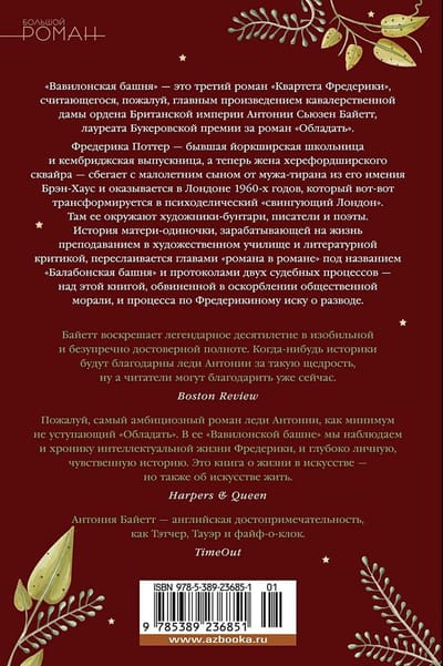 «Вавилонская башня» — это третий роман «Квартета Фредерики», считающегося, пожалуй, главным произведением кавалерственной дамы ордена Британской империи Антонии Сьюзен Байетт. Тетралогия писалась в течение четверти века, и сюжет ее также имеет четвертьвековой охват, причем первые два романа («Дама в саду», «Живая вещь») вышли еще до удостоенного Букеровской премии международного бестселлера «Обладать», а третий и четвертый — после. Итак, Фредерика Поттер — бывшая йоркширская школьница и кембриджская выпускница, а теперь жена херефордширского сквайра — сбегает с малолетним сыном от мужа-тирана из его имения Брэн-Хаус и оказывается в Лондоне 1960-х годов, который вот-вот трансформируется в психоделический «свингующий Лондон». Там ее окружают художники-бунтари, писатели и поэты. История матери-одиночки, зарабатывающей на жизнь преподаванием в художественном училище и литературной критикой, переслаивается главами «романа в романе» под названием «Балабонская башня» и протоколами двух судебных процессов — над этой книгой, обвиненной в оскорблении общественной морали, и по Фредерикиному иску о разводе. «Байетт воскрешает легендарное десятилетие в изобильной и безупречно достоверной полноте. Когда-нибудь историки будут благодарны леди Антонии за такую щедрость, ну а читатели могут благодарить уже сейчас» (Boston Review).