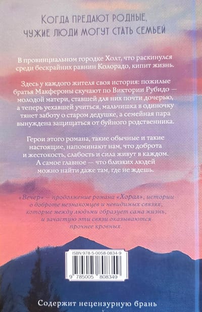 В провинциальном городке Холт, что раскинулся среди бескрайних равнин Колорадо, кипит жизнь. Здесь у каждого жителя своя история: пожилые братья Макфероны скучают по Виктории Рубидо — молодой матери, ставшей для них почти дочерью, а теперь уехавшей учиться, мальчишка в одиночку тянет заботу о старом дедушке, а семейная пара вынуждена защищаться от буйного родственника.