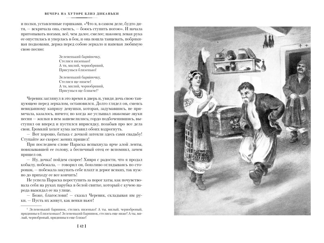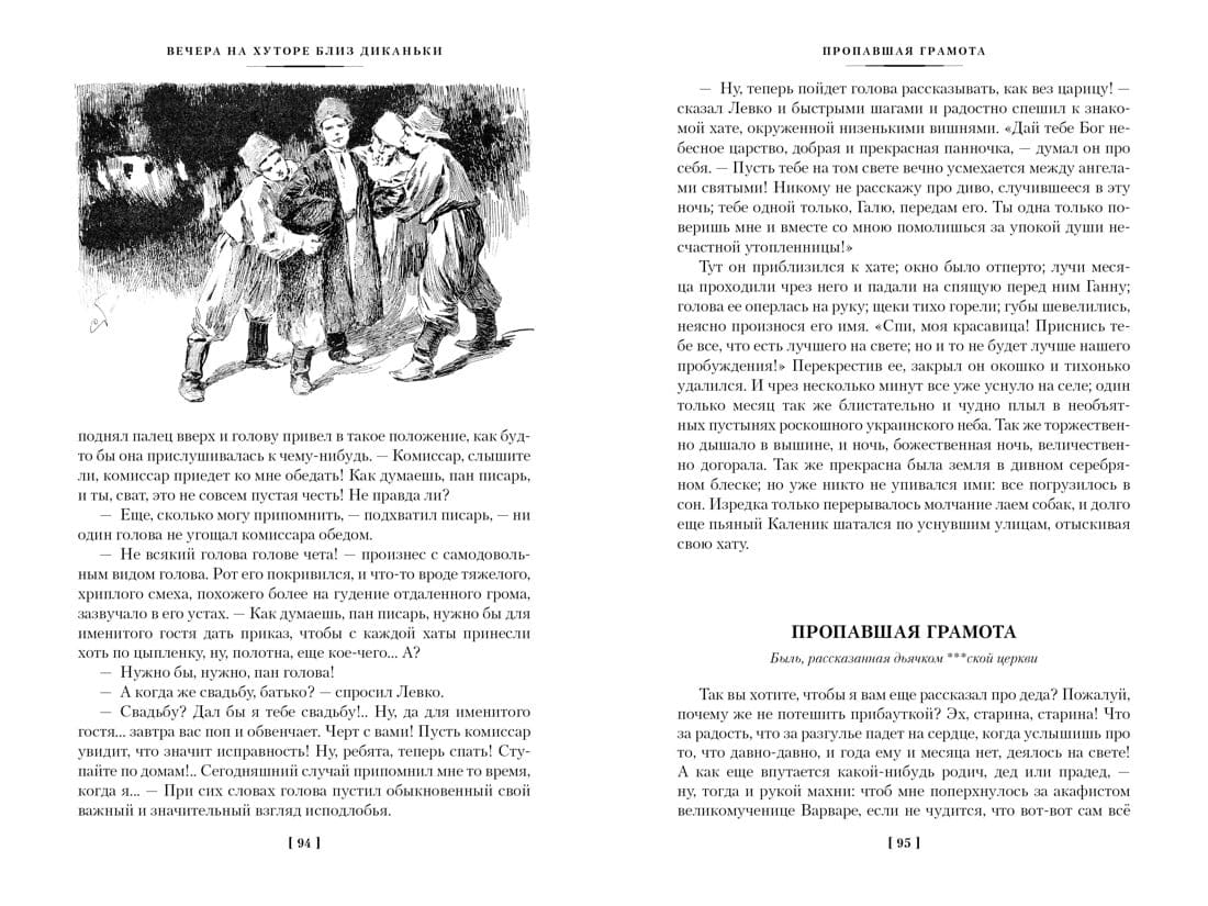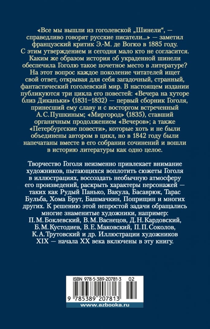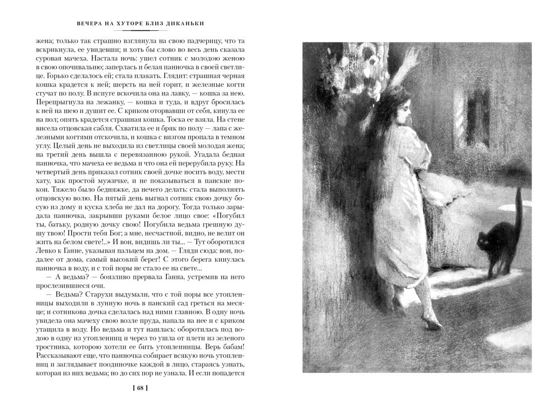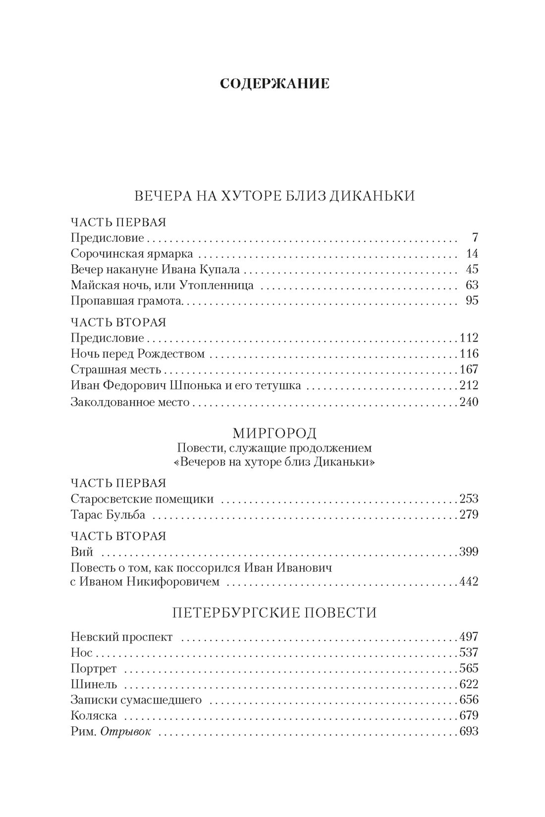 В настоящем издании публикуются три цикла его повестей: «Вечера на хуторе близ Диканьки» (1831–1832) — первый сборник Гоголя, принесший ему славу и с восторгом встреченный А. С. Пушкиным; «Миргород» (1835), ставший органичным продолжением «Вечеров»; а также «Петербургские повести», которые, хоть и не были объединены автором в цикл, но в 1842 году были напечатаны вместе в его собрании сочинений и вошли в историю литературы как одно целое. В издание включены иллюстрации художников XIX — начала ХХ века: П. М. Боклевского, В. М. Васнецова, Д. Н. Кардовского, Б. М. Кустодиева, В. Е. Маковского, П. П. Соколова, К. А. Трутовского и др.