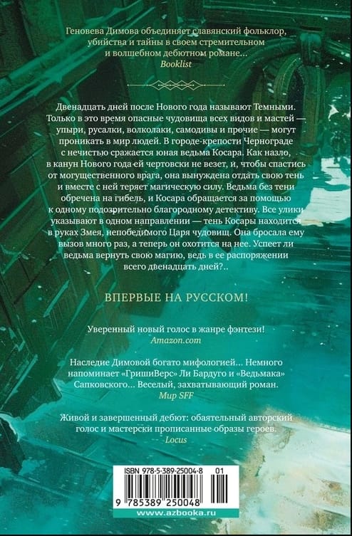 Двенадцать дней после Нового года называют Темными. Только в это время опасные чудовища всех видов и мастей — упыри, русалки, волколаки, самодивы и прочие — могут проникать в мир людей. В городе-крепости Чернограде с нечистью сражается юная ведьма Косара. Как назло, в канун Нового года ей чертовски не везет, и, чтобы спастись от могущественного врага, она вынуждена отдать свою тень и вместе с ней теряет магическую силу. Ведьма без тени обречена на гибель, и Косара обращается за помощью к одному подозрительно благородному детективу. Все улики указывают в одном направлении — тень Косары находится в руках Змея, непобедимого Царя чудовищ. Она бросала ему вызов много раз, а теперь он охотится на нее. Успеет ли ведьма вернуть свою магию, ведь в ее распоряжении всего двенадцать дней?