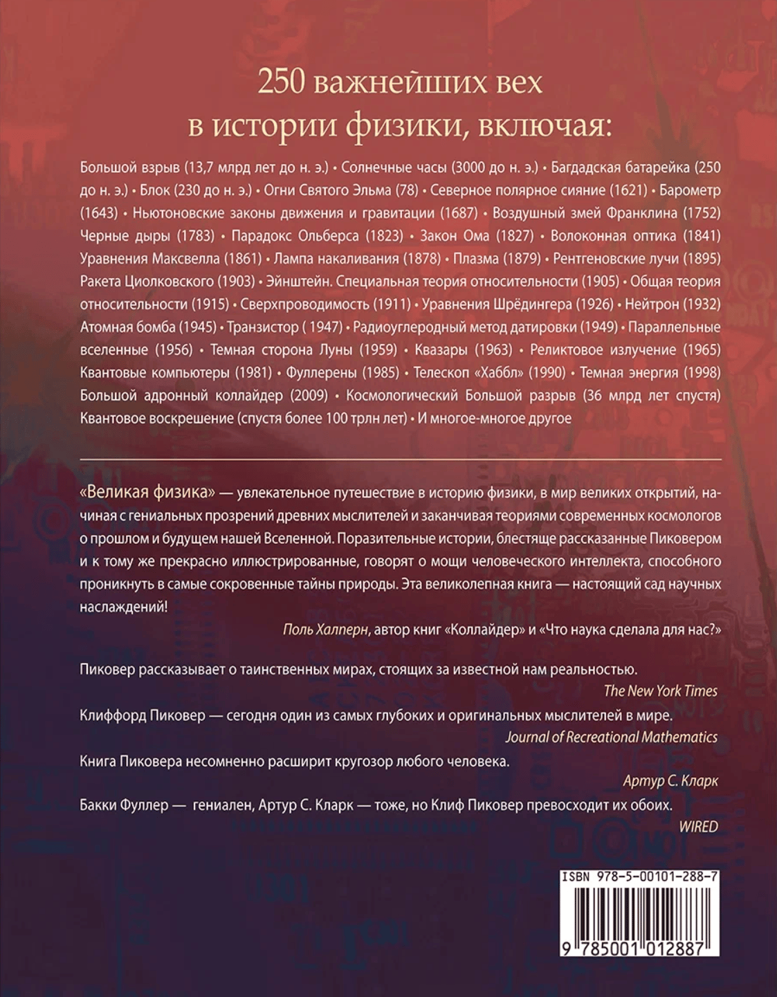 Клиффорд Пиковер (р. 1957) - известный ученый и один из лучших в мире популяризаторов науки. Его «Великая физика» - собрание блестящих эссе о великих открытиях выдающихся ученых, начиная с мыслителей прошлого таких как Пифагор, Максвелл, и заканчивая нашими современниками - Эйнштейном, Хокингом и многими другими. Эта великолепно иллюстрированная книга - для всех, кто интересуется самыми главными вопросами, веками занимавшими лучшие умы человечества: как устроен мир, каково его прошлое и будущее, и какое место в нем занимаем мы, люди.