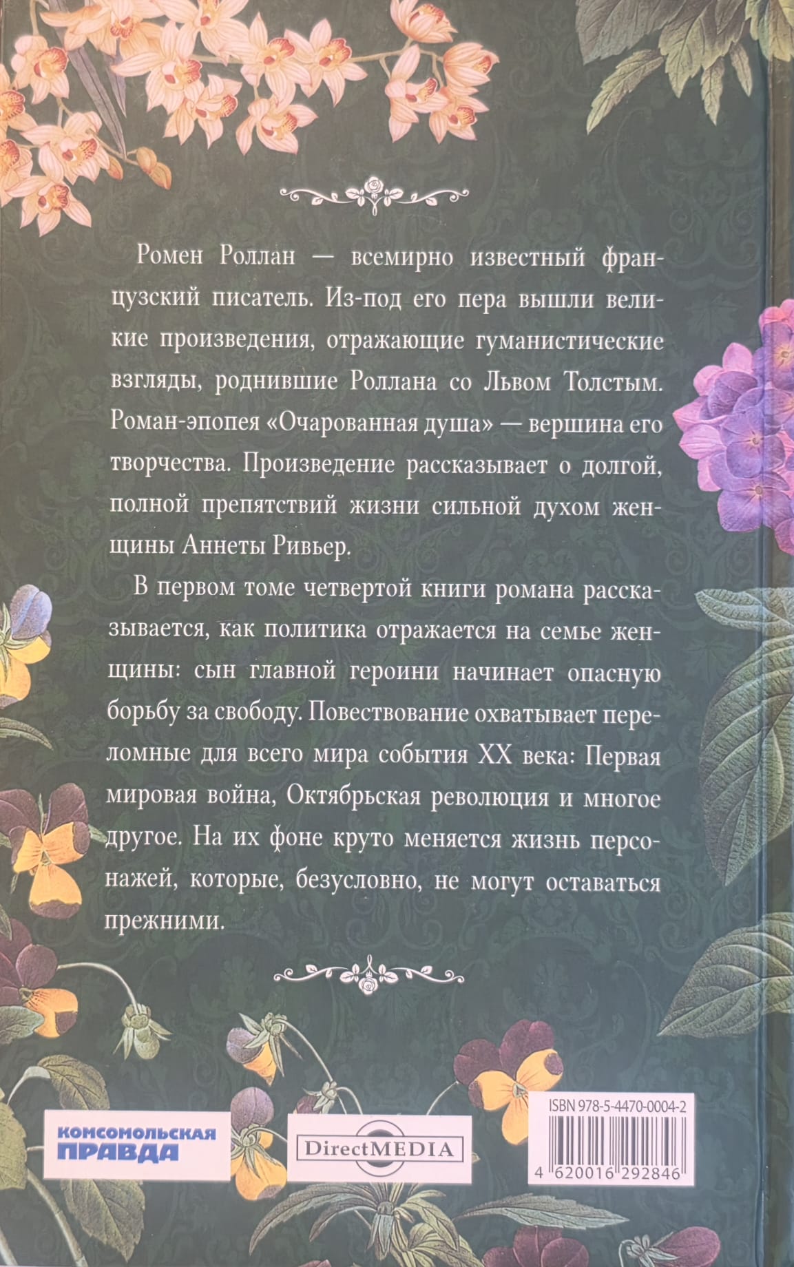 Ромен Роллан - всемирно известный французский писатель. Из-под его пера вышли великие произведения, отражающие гуманистические взгляды и роднящие Роллана со Львом Толстым. Роман-эпопея «Очарованная душа» - вершина его творчества. Произведение рассказывает о долгой, полной препятствий жизни сильной духом Аннеты Ривьер. В первом томе четвертой книги романа рассказывается, как политика отражается на семье женщины: сын главной героини начинает опасную борьбу за свободу. Повествование охватывает переломные для всего мира события XX века: Первая мировая война, Октябрьская революция и многое другое. На их фоне круто меняется жизнь персонажей, которые, безусловно, не могут оставаться прежними.