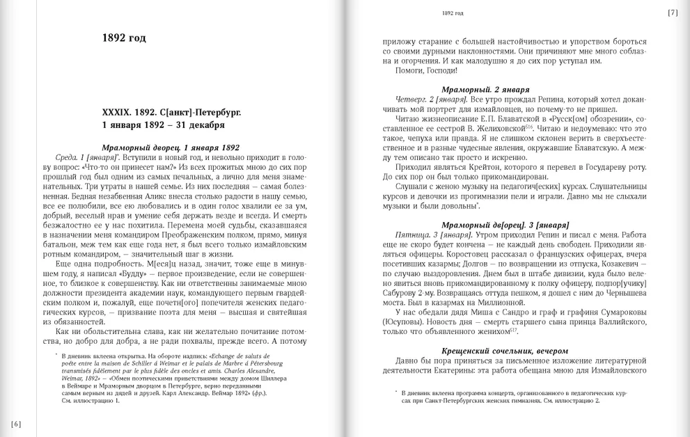 Настоящее издание дневников великого князя Константина Константиновича охватывает первые пять с половиной лет его президентства в Императорской Академии наук — с мая 1889 до конца 1894 г. Получив столь высокую и ответственную должность, Константин Константинович немедленно стал участвовать во всех делах Академии наук: в дневниках за этот период описаны подробности как внешней, официальной, так и внутренней жизни Академии наук и подведомственных ей учреждений. В апреле 1891 г. Константин Константинович становится командиром лейб-гвардии Преображенского полка, и в его дневниках получает отражение полковая жизнь этого одного из старейших полков Российской армии. Не забывает великий князь и лейб-гвардии Измайловский полк, где ранее командовал ротой: он продолжает посещать организованные им прежде Измайловские досуги, где читает стихи и участвует в постановках пьес.