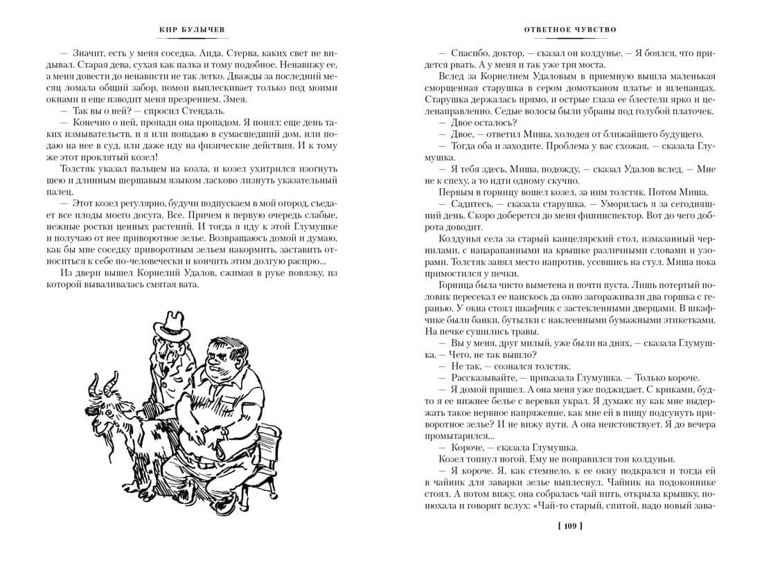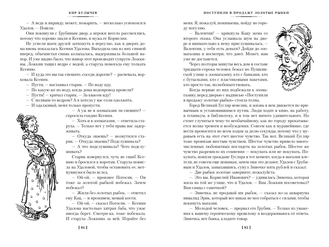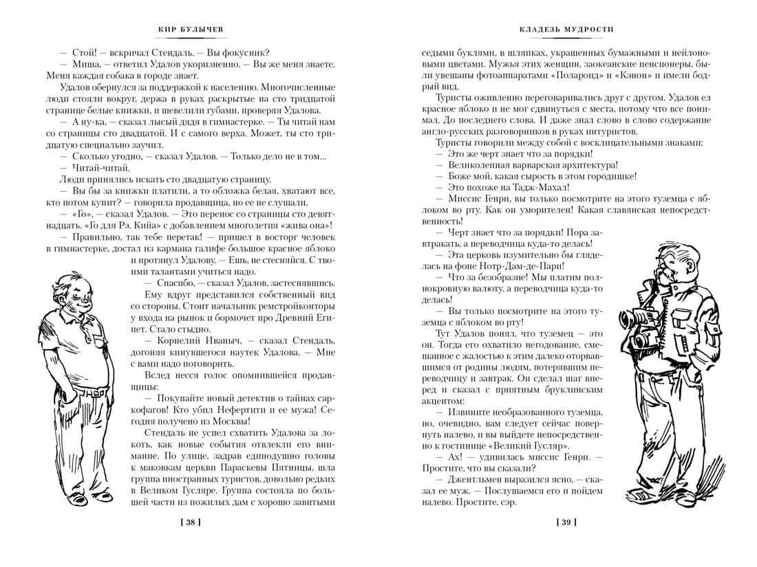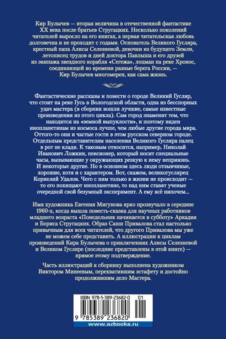 Кир Булычев — вторая величина в отечественной фантастике XX века после братьев Стругацких. Несколько поколений читателей выросло на его книгах, а первая читательская любовь долговечна и не проходит с годами. Основатель Великого Гусляра, крестный папа Алисы Селезневой, девочки из будущего Земли, летописец трудов и дней доктора Павлыша и его друзей из экипажа межпланетного звездолета «Сегежа», лоцман на реке Хронос, соединяющей во времени разные берега России, — Кир Булычев многомерен, как сама жизнь, в его литературной вселенной есть место и шутливому розыгрышу, и едкой, беспощадной иронии, и мудрости ученого и провидца. В ней есть все, кроме скуки. Фантастические рассказы и повести о городе Великий Гусляр, что стоит на реке Гусь в Вологодской области, одна из бесспорных удач мастера (в сборник вошли лучшие, самые известные произведения из этого цикла). Сам город знаменит тем, что находится на «земной выпуклости», и поэтому виден инопланетянам из космоса лучше, чем любые другие города мира. Оттого-то они и частые гости в этом русском северном городе. Отдельным представителям населения Великого Гусляра палец в рот не клади. К таковым относится, например, Николай Иванович Ложкин, пенсионер, который носит специальные часы, вызывающие у окружающих резкую к нему неприязнь. И некоторые другие. Но в основном здесь люди отзывчивые, хорошие, хотя и с характером. Вот, скажем, великогуслярец Корнелий Удалов. Чего с ним только в жизни не происходит — то его похищают инопланетяне, то над ним ставят ученые очередной свой безумный эксперимент. А ему все нипочем... Имя художника Евгения Мигунова ярко прозвучало в середине 1960-х, когда вышла повесть-сказка для научных работников младшего возраста «Понедельник начинается в субботу» Аркадия и Бориса Стругацких. Образ Саши Привалова стал настолько привычным для всех читателей, что другого Привалова мы уже не можем себе представить. А иллюстрации к циклам произведений Кира Булычева о приключениях Алисы Селезневой и Великом Гусляре (последние представлены в этой книге) — прямое этому подтверждение. Часть иллюстраций к сборнику выполнена художником Виктором Минеевым, перехватившим эстафету и достойно продолжившим дело Мастера.
