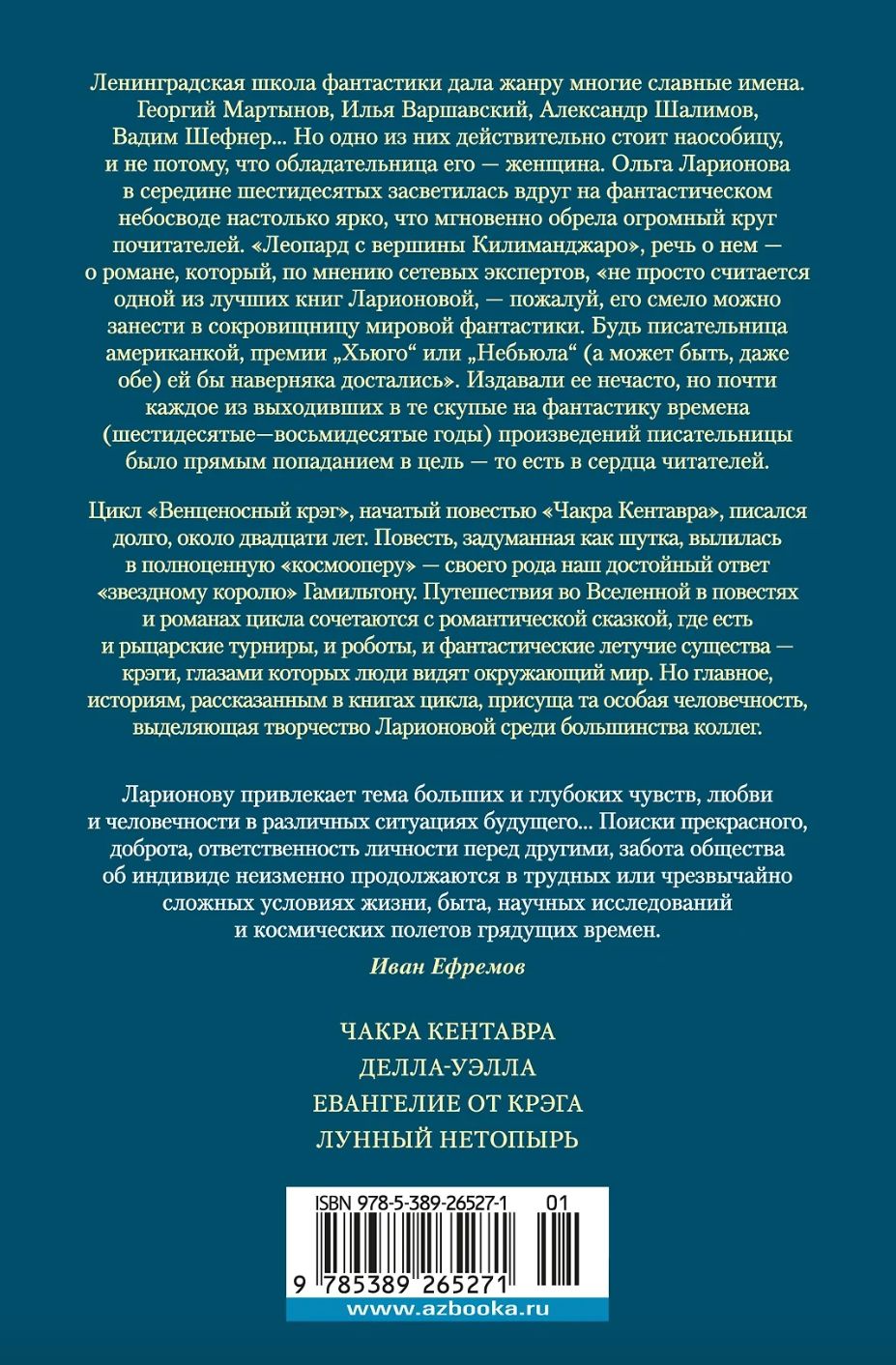 Ленинградская школа фантастики дала жанру многие славные имена. Георгий Мартынов, Илья Варшавский, Вадим Шефнер, Александр Шалимов… Но одно из них действительно стоит наособицу, и не потому, что обладательница его — женщина. Ольга Ларионова в середине шестидесятых засветилась вдруг на фантастическом небосводе настолько ярко, что мгновенно обрела огромный круг почитателей. «Леопард с вершины Килиманджаро», мы говорим о нем — о романе, который, по мнению сетевых экспертов, «не просто считается одной из лучших книг Ларионовой, — пожалуй, его смело можно занести в сокровищницу мировой фантастики. Будь писательница американкой, премии «Хьюго» или «Небьюла» (а может быть, даже обе) ей бы наверняка достались». Издавали ее нечасто, но почти каждое из выходивших в те скупые на фантастику времена (шестидесятые — восьмидесятые годы) произведений писательницы было прямым попаданием в цель — то есть в сердца читателей.