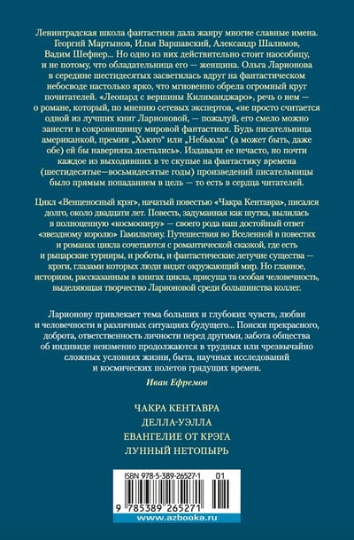 Цикл «Венценосный крэг», начатый повестью «Чакра Кентавра», писался долго, около двадцати лет. Повесть, задуманная как шутка, вылилась в полноценную «космооперу» — своего рода наш достойный ответ «звездному королю» Гамильтону. Путешествия во Вселенной в повестях и романах цикла сочетаются с романтической сказкой, где есть и рыцарские турниры, и роботы, и фантастические летучие существа — крэги, глазами которых люди видят окружающий мир. Но главное, историям, рассказанным в книгах цикла, присуща та особая человечность, выделяющая творчество Ларионовой среди большинства коллег.
