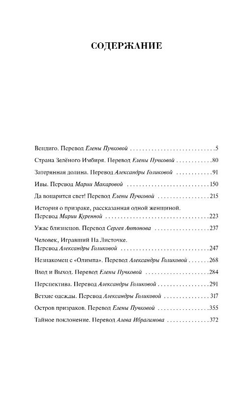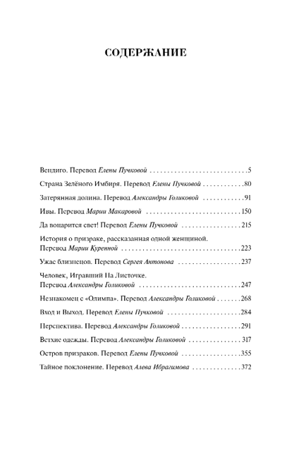 Кроме «Вендиго», в сборник вошли и другие загадочные рассказы Блэквуда: «Страна Зелёного Имбиря», «Затерянная долина», «Ивы», «Да воцарится свет!», «История о призраке», «Ужас близнецов», каждый из которых раскрывает уникальные грани мистики, древних верований и человеческих страхов.