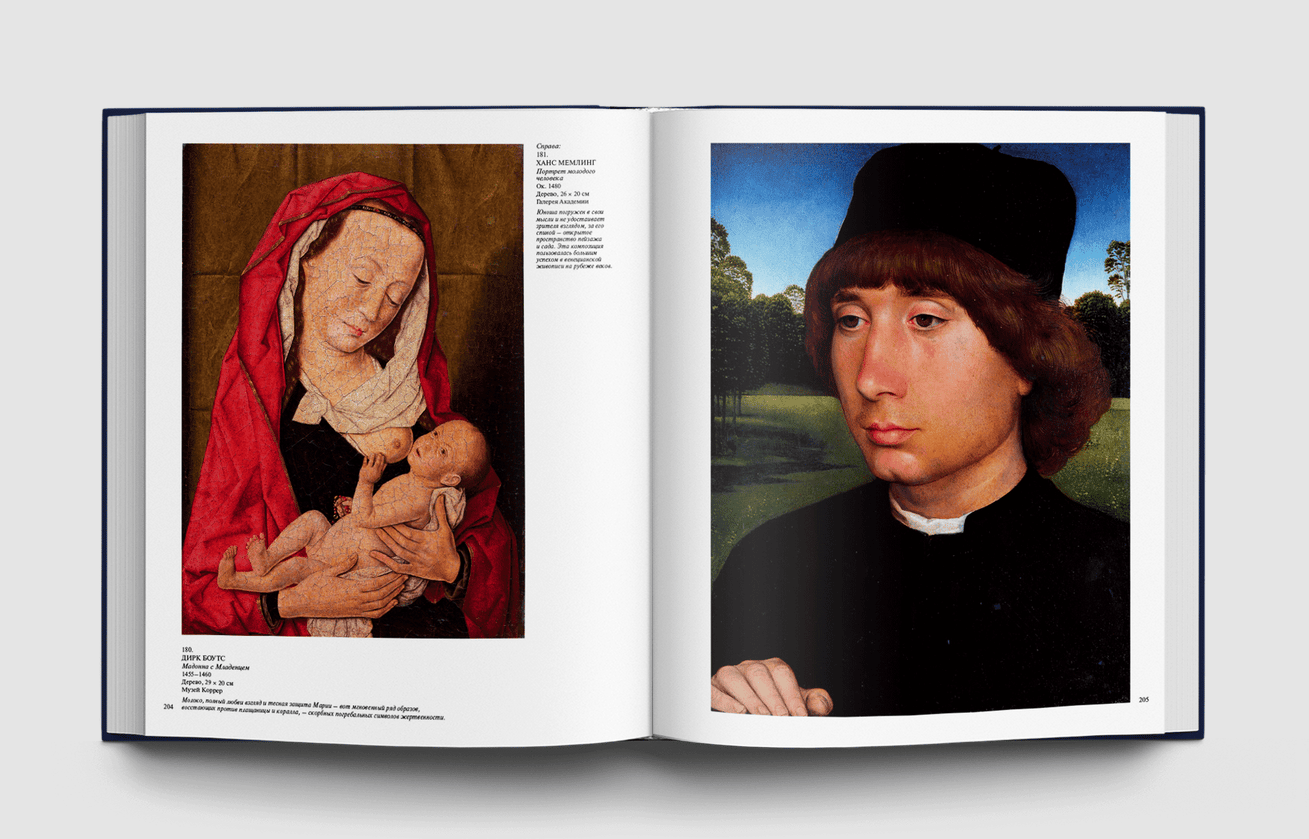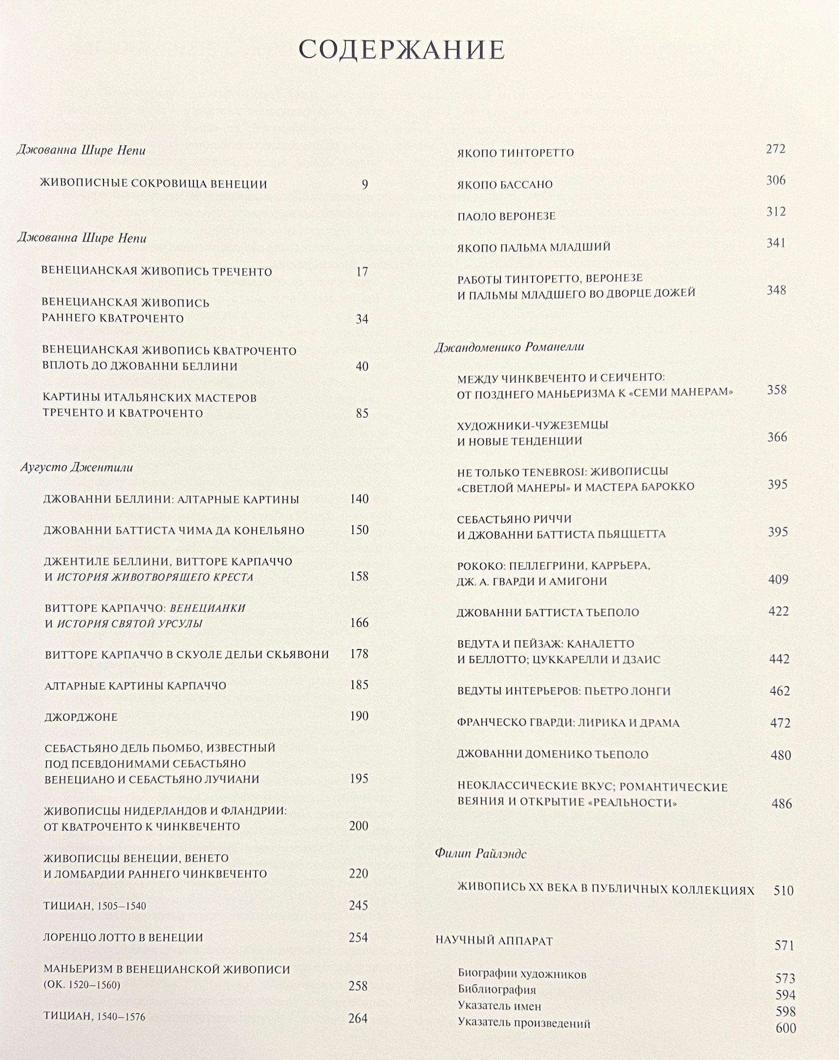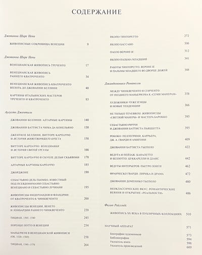 В книге представлены работы Джованни Беллини и Тициана, Тинторетто, Веронезе и других блистательных мастеров Возрождения. Музеи Венеции хранят также замечательные картины кисти европейских авторов – Мемлинга, Босха, К. Массейса, А. Ван Дейка, «малых голландцев», а также произведения художников ХХ века – Пикассо, Брака, Леже, Кандинского, Мондриана, Климта, Клее, Шагала, Макса Эрнста, Магритта, Бэкона. Интересно собрание работ целой плеяды итальянских художников, близких к футуризму и метафизической живописи.