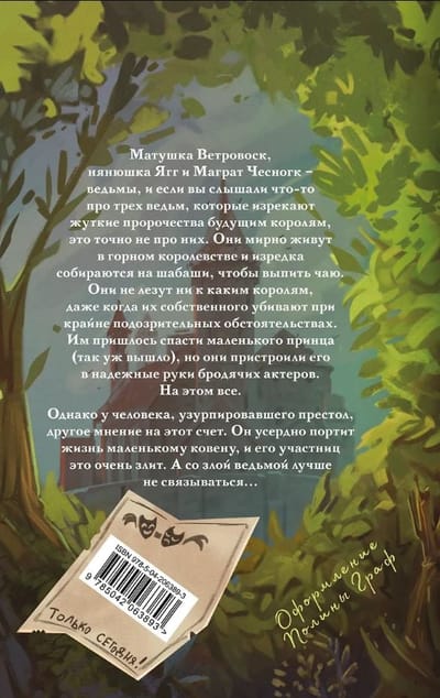 Матушка Ветровоск, нянюшка Ягг и Маграт Чесногк – ведьмы. Они мирно живут в горном королевстве, изредка собираются на шабаши, чтобы выпить чаю, и думать не думают пророчествовать (хотя нянюшка рада похохотать над хорошей шуткой). Они не лезут ни к каким королям, даже когда их собственного убивают при крайне подозрительных обстоятельствах. Им пришлось спасти маленького принца (так уж вышло), но они пристроили его в надёжные руки бродячих актёров. На этом всё.