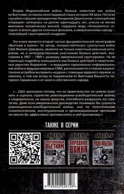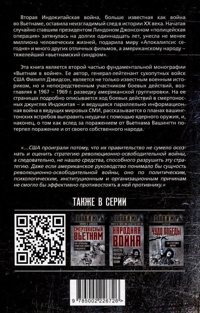 Вторая Индокитайская война, больше известная как война во Вьетнаме, оставила неизгладимый след в истории XX века. Начатая случайно ставшим президентом Линдоном Джонсоном «полицейская операция» затянулась на долгих одиннадцать лет, унесла не менее миллиона человеческих жизней, подарила миру «Апокалипсис сегодня» и много других отличных фильмов, а американскому народу – тяжелейший «вьетнамский синдром». Эта книга является второй частью фундаментальной монографии «Вьетнам в войне». Ее автор, генерал-лейтенант сухопутных войск США Филипп Дэвидсон, является не только известным военным историком, но и непосредственным участником боевых действий, возглавляя в 1967–1969 гг. разведку американской группировки. На ее страницах подробно описывается ход боевых действий в смертоносных джунглях Индокитая – и ведущаяся параллельно информационная война в ведущих мировых СМИ, рассказывается о планах вашингтонских ястребов выправить неудачи с помощью ядерного оружия, и наконец о том как за поражением от вьетнамского народа последовало поражение Америки и от собственного народа.