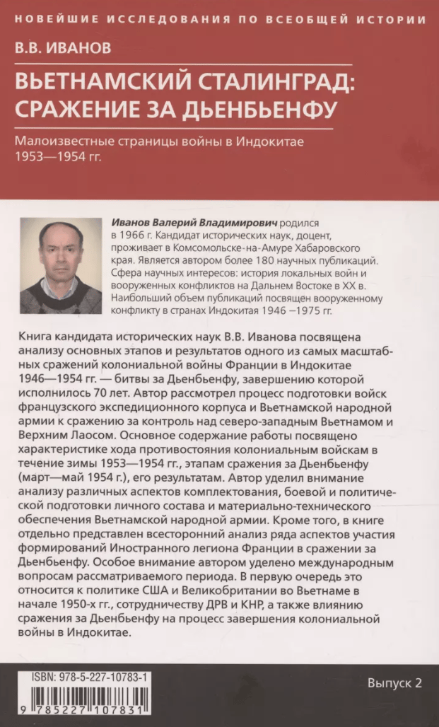 Книга кандидата исторических наук В.В. Иванова посвящена анализу основных этапов и результатов одного из самых масштабных сражений колониальной войны Франции в Индокитае 1946—1954 гг. — битвы за Дьенбьенфу, завершению которой исполнилось 70 лет. Автор рассмотрел процесс подготовки войск французского экспедиционного корпуса и Вьетнамской народной армии к сражению за контроль над Северо-Западным Вьетнамом и Верхним Лаосом. Основное содержание работы посвящено характеристике хода противостояния колониальным войскам в течение зимы 1953/54 г., этапам сражения за Дьенбьенфу (март—май 1954 г.), его результатам. Автор уделил внимание анализу различных аспектов комплектования, боевой и политической подготовки личного состава и материально-технического обеспечения Вьетнамской народной армии. Кроме того, в книге отдельно представлен всесторонний анализ ряда аспектов участия формирований Иностранного легиона Франции в сражении за Дьенбьенфу. Особое внимание автором уделено международным вопросам рассматриваемого периода. В первую очередь это относится к политике США и Великобритании во Вьетнаме в начале 1950-х гг., сотрудничеству ДРВ и КНР, а также влиянию сражения за Дьенбьенфу на процесс завершения колониальной войны в Индокитае.