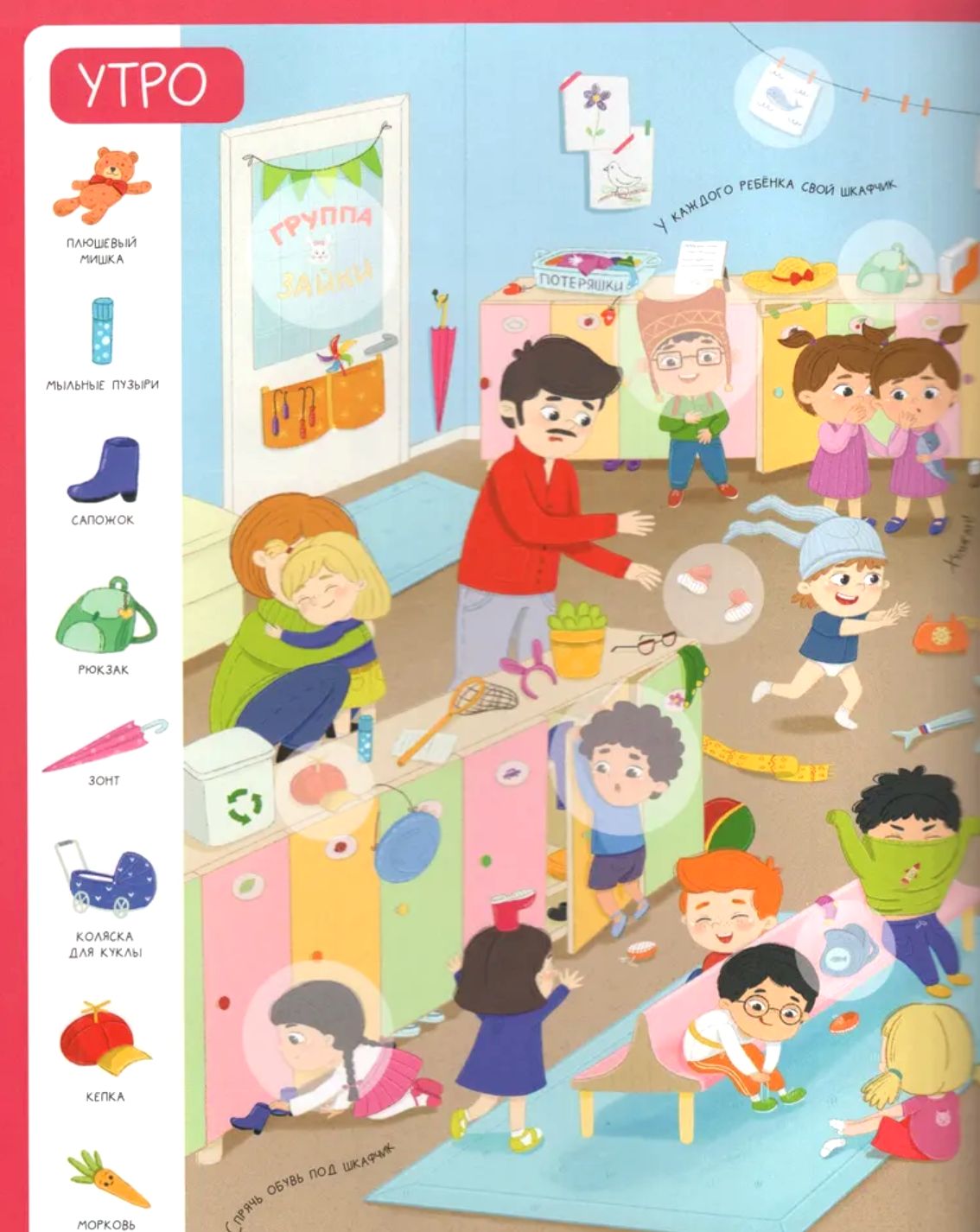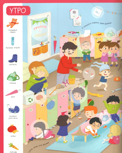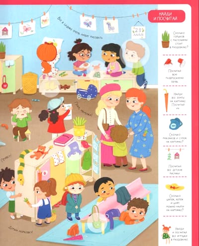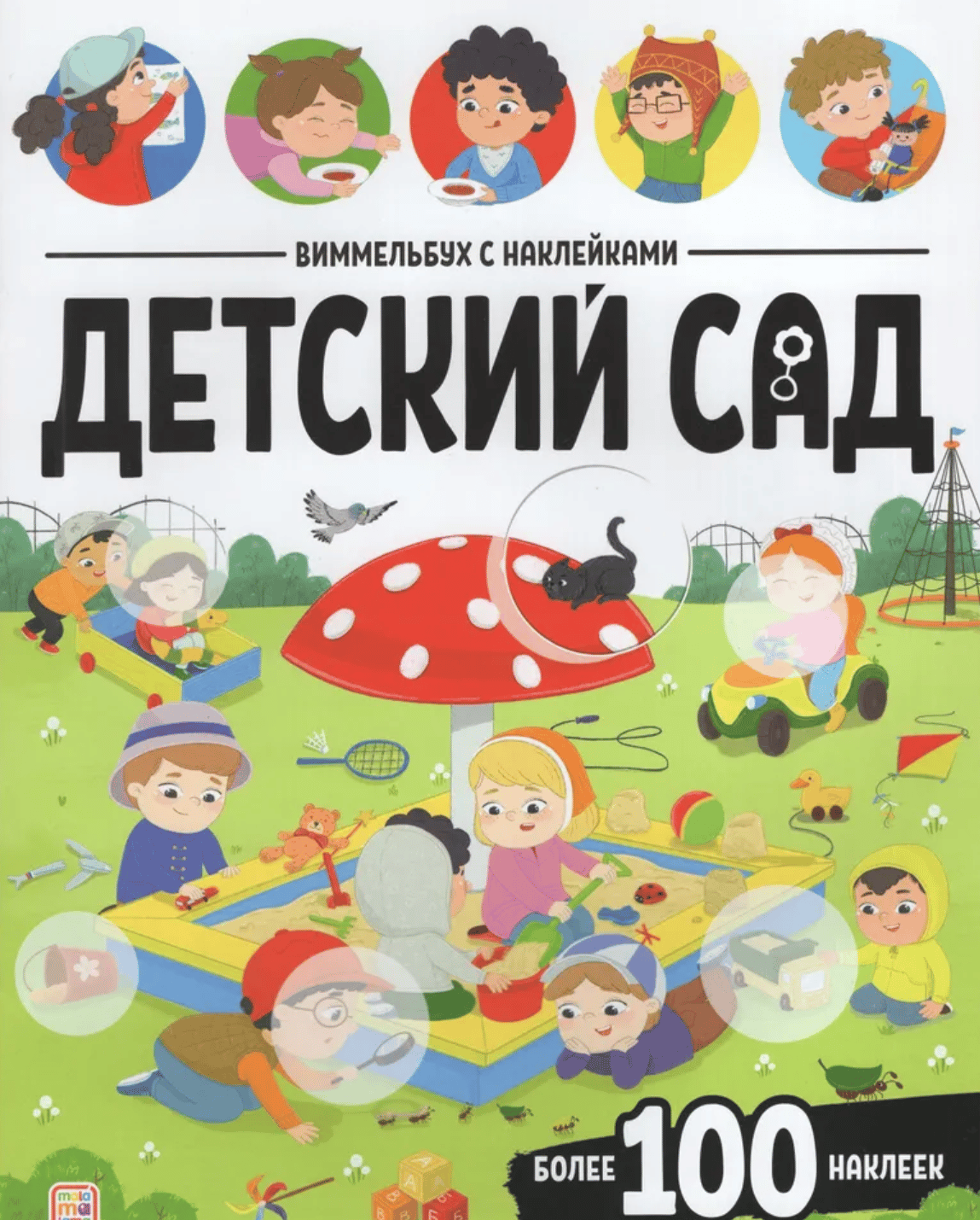 Отправляйтесь в гости к веселым деткам вместе с Malamalama! Красочные иллюстрации со множеством персонажей и маленьких историй, увлекательные игры на счет и внимательность, яркие наклейки - все это ждет вас на страницах виммельбуха «Детский сад». Вместе с малышом найдите место для каждой наклейки и оживите картинки.