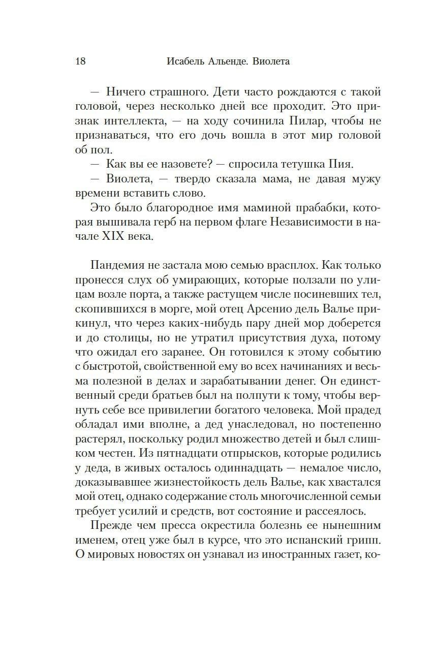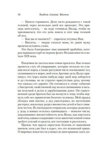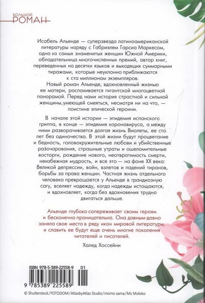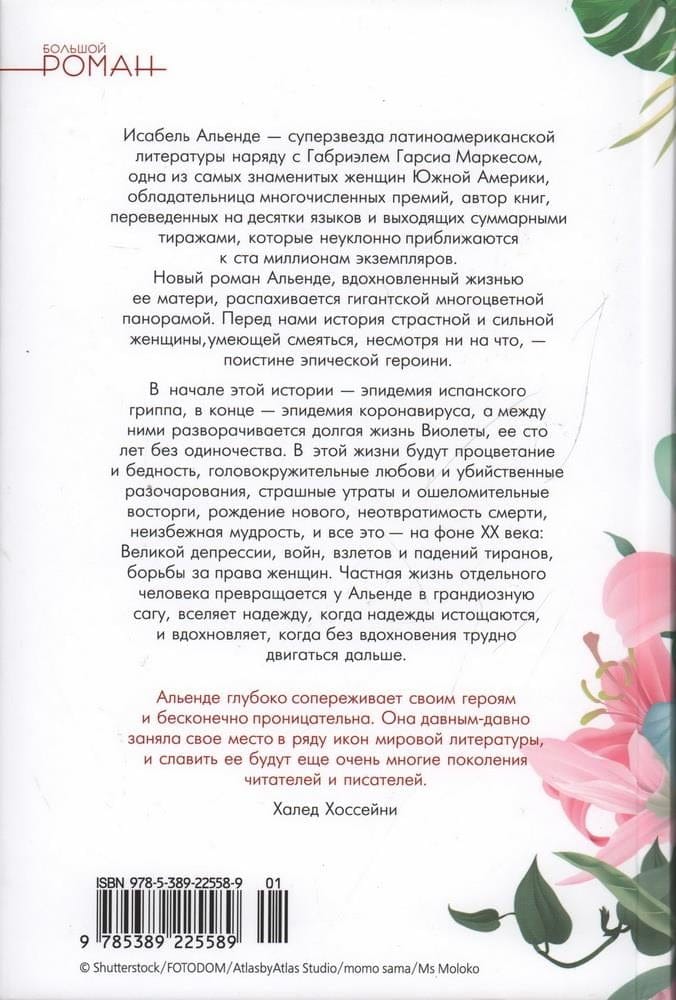 Исабель Альенде — суперзвезда латиноамериканской литературы наряду с Габриэлем Гарсиа Маркесом, одна из самых знаменитых женщин Южной Америки, обладательница многочисленных премий, автор книг, переведенных на десятки языков и выходящих суммарными тиражами, которые неуклонно приближаются к ста миллионам экземпляров. Новый роман Альенде, вдохновленный жизнью ее матери, распахивается гигантской многоцветной панорамой. Перед нами история страстной и сильной женщины, умеющей смеяться, несмотря ни на что, — героини поистине эпической. В начале этой истории — эпидемия испанского гриппа, в конце — эпидемия коронавируса, а между ними разворачивается долгая жизнь Виолеты, ее сто лет без одиночества. В этой жизни будут процветание и бедность, головокружительные любови и убийственные разочарования, страшные утраты и ошеломительные восторги, рождение нового, неотвратимость смерти, неизбежная мудрость. XX век — Великая депрессия, войны, взлеты и падения тиранов, борьба за права женщин — наложит отпечаток на судьбу Виолеты, родившейся однажды ночью во время бури и прожившей бурную жизнь до дна от первой до последней минуты, от пандемии до пандемии. Частная жизнь отдельного человека превращается у Альенде в грандиозную сагу, вселяет надежду, когда надежды истощаются, и вдохновляет, когда без вдохновения трудно двигаться дальше.