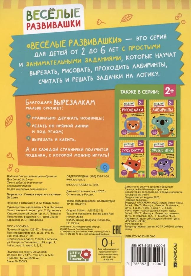 «Вырезалки» для детей от 2-х лет из серии «Веселые развивашки» помогут ребенку развить мышление, мелкую моторику и координацию движений. Играя в игры и выполняя задания в тетради, малыш научится: